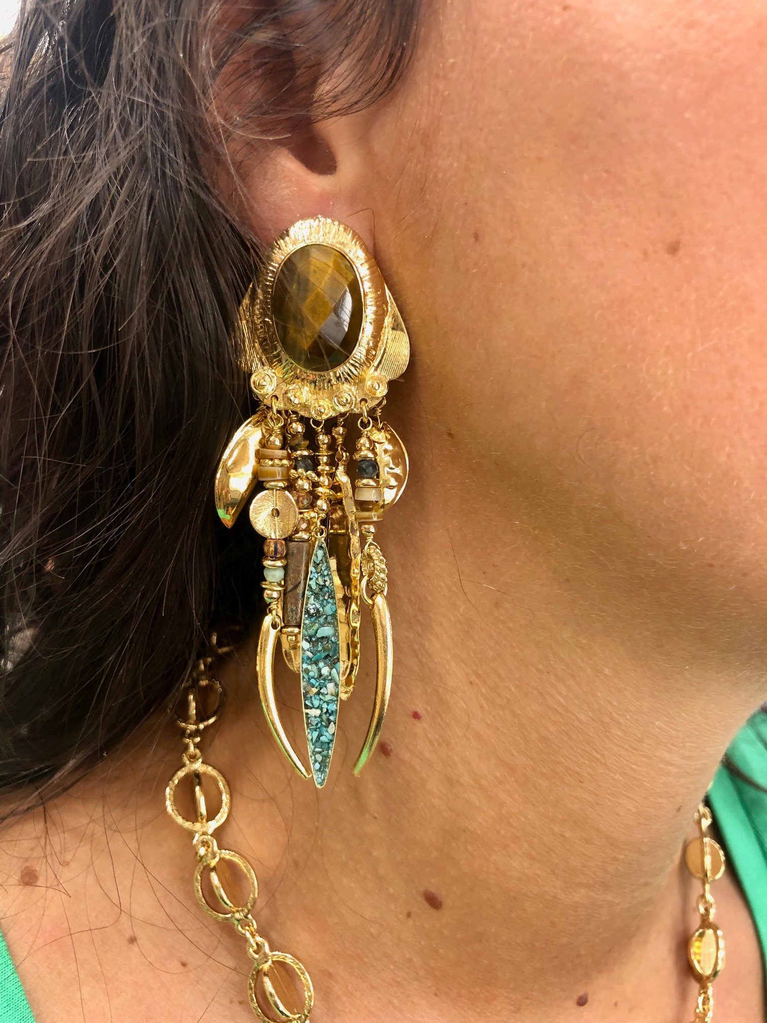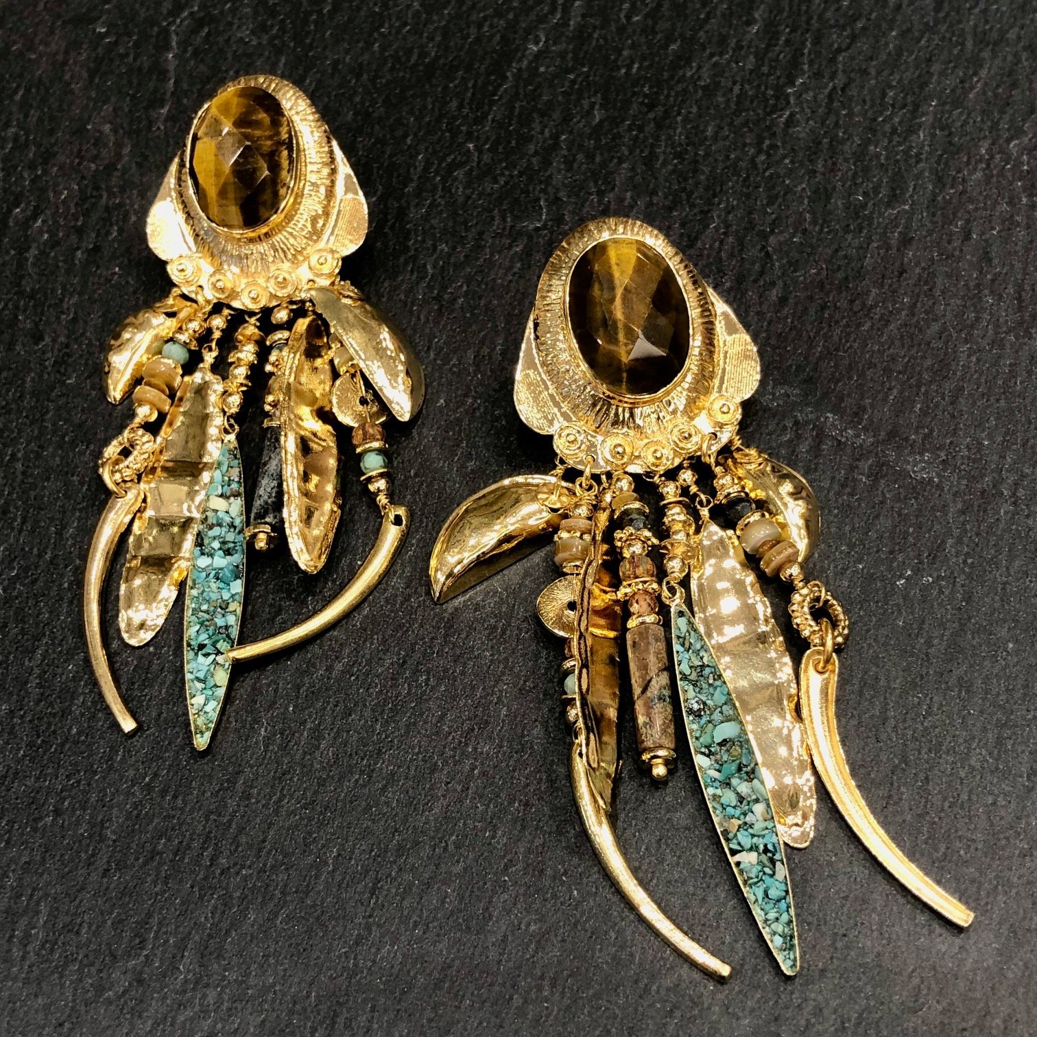Boucles d’oreilles dorées à l’or fin, ornées de multiples pampilles pendantes, oeil de tigre en cabochon sur le lobe.