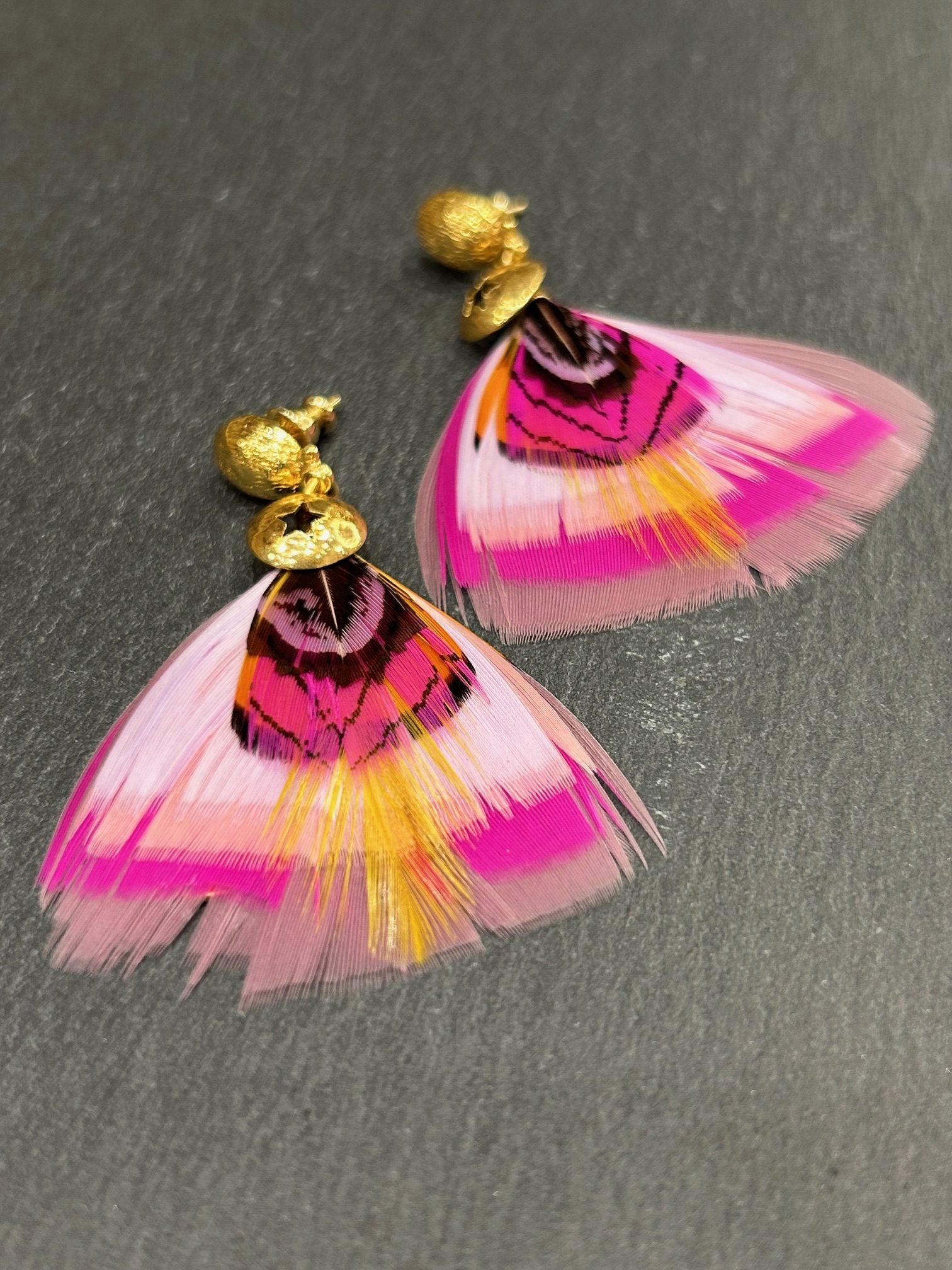Boucles d’oreilles doré à l or 24 carats, composées d’un assemblage en dégradé de plumes colorées ,fuchsia, parme, violet.