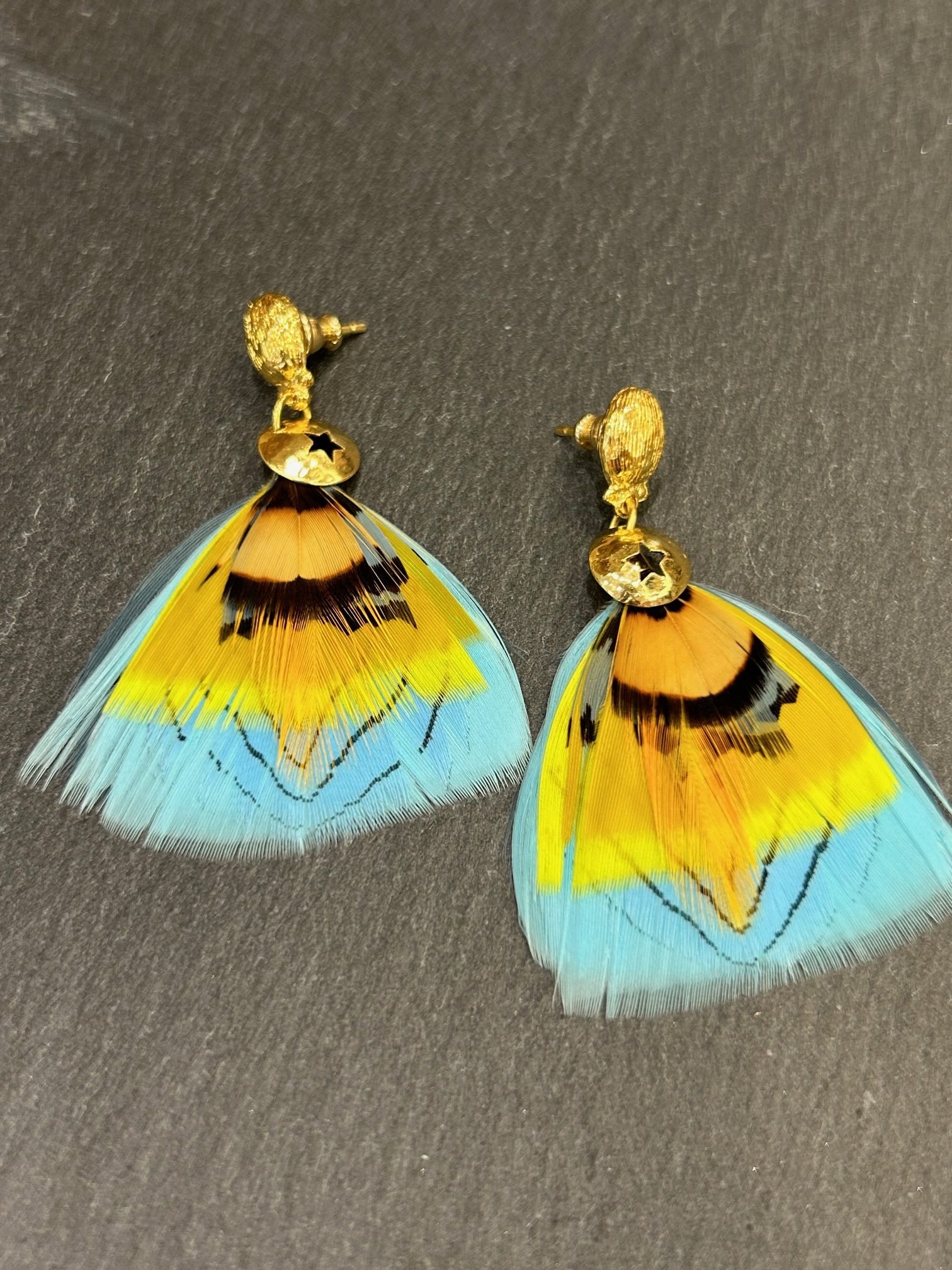 Boucles d’oreilles doré à l or 24 carats, composées d’un assemblage en dégradé de plumes colorées turquoise, jaune, orange.