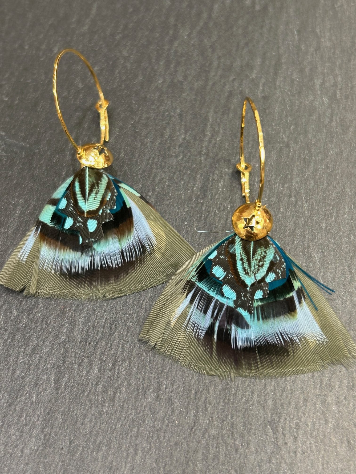 Boucles d’oreilles forme créoles doré à l or 24 carats, composées d’un assemblage en dégradé de plumes colorées gris kaki, noir, bleu, turquoise, bleu canard.
