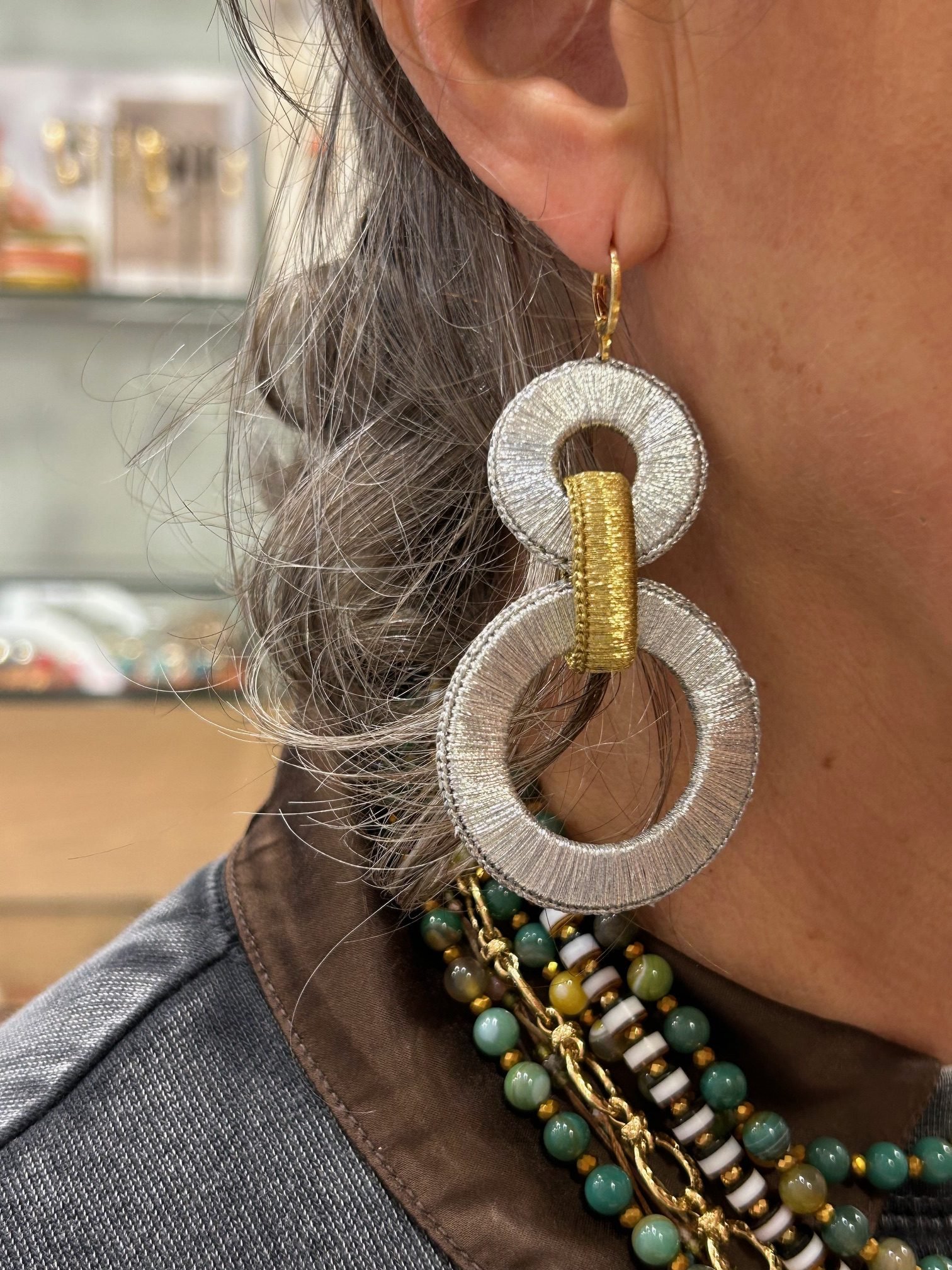 Boucles d’oreilles dorées composées de deux délicats cercles argent reliés par un maillon ov et rouge, cousus à la main en fil à broder.