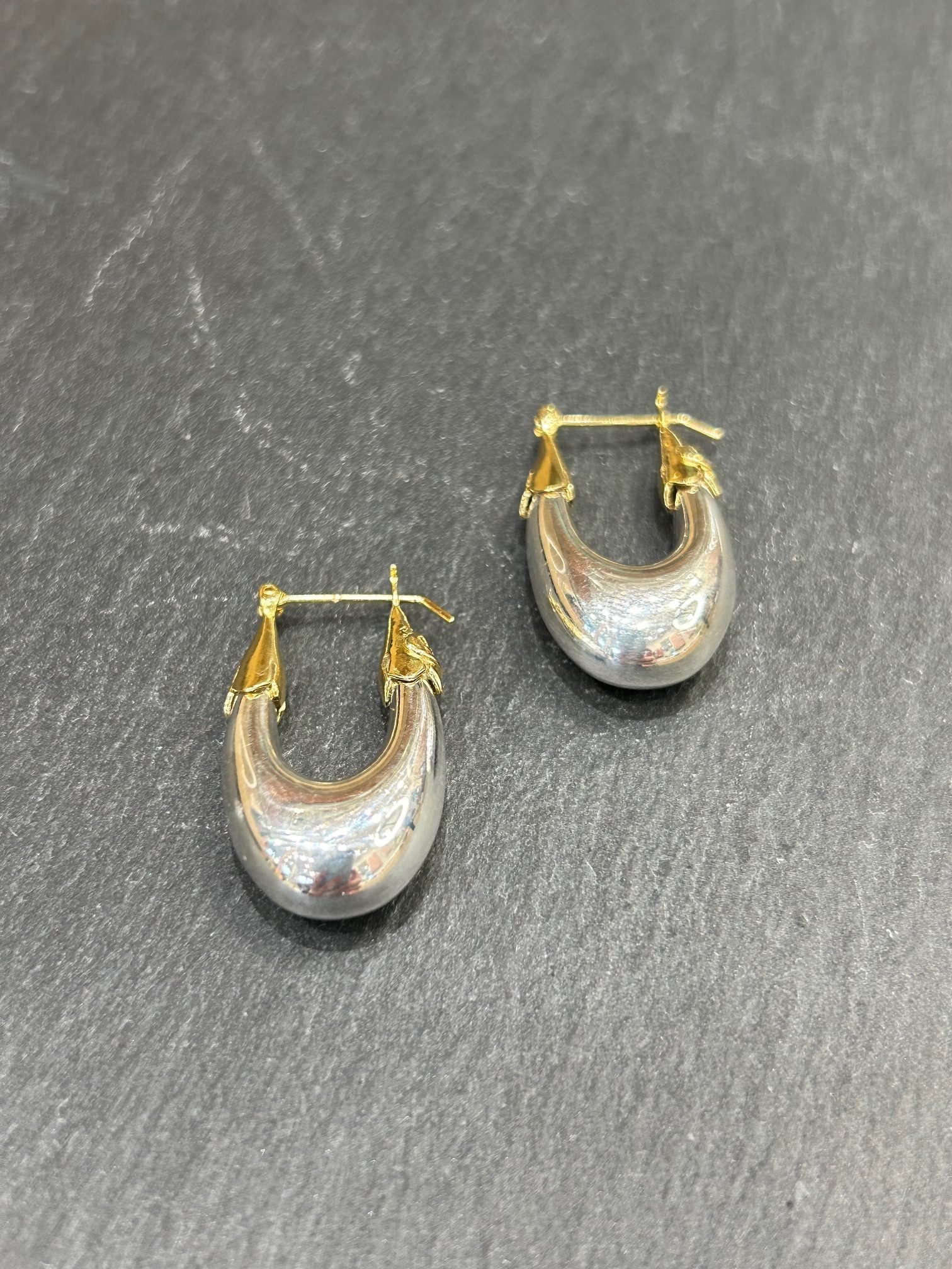 Boucles d’oreilles Ecume petit modèle en métal argenté, bicolore extrémités dorées à l’or fin en forme de créoles allongées.