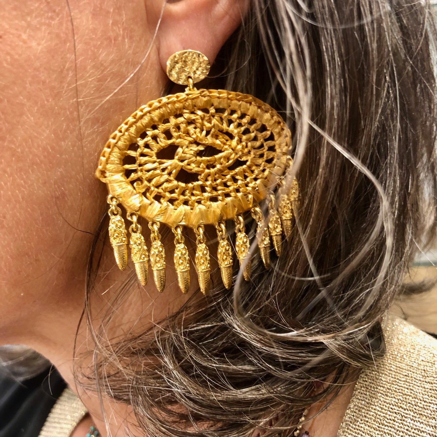 Boucles d oreilles dorées à l or fin 24 carats, composées d’un motif finement crocheté en raphia cuivré et ornées de multiples pampilles dorées.