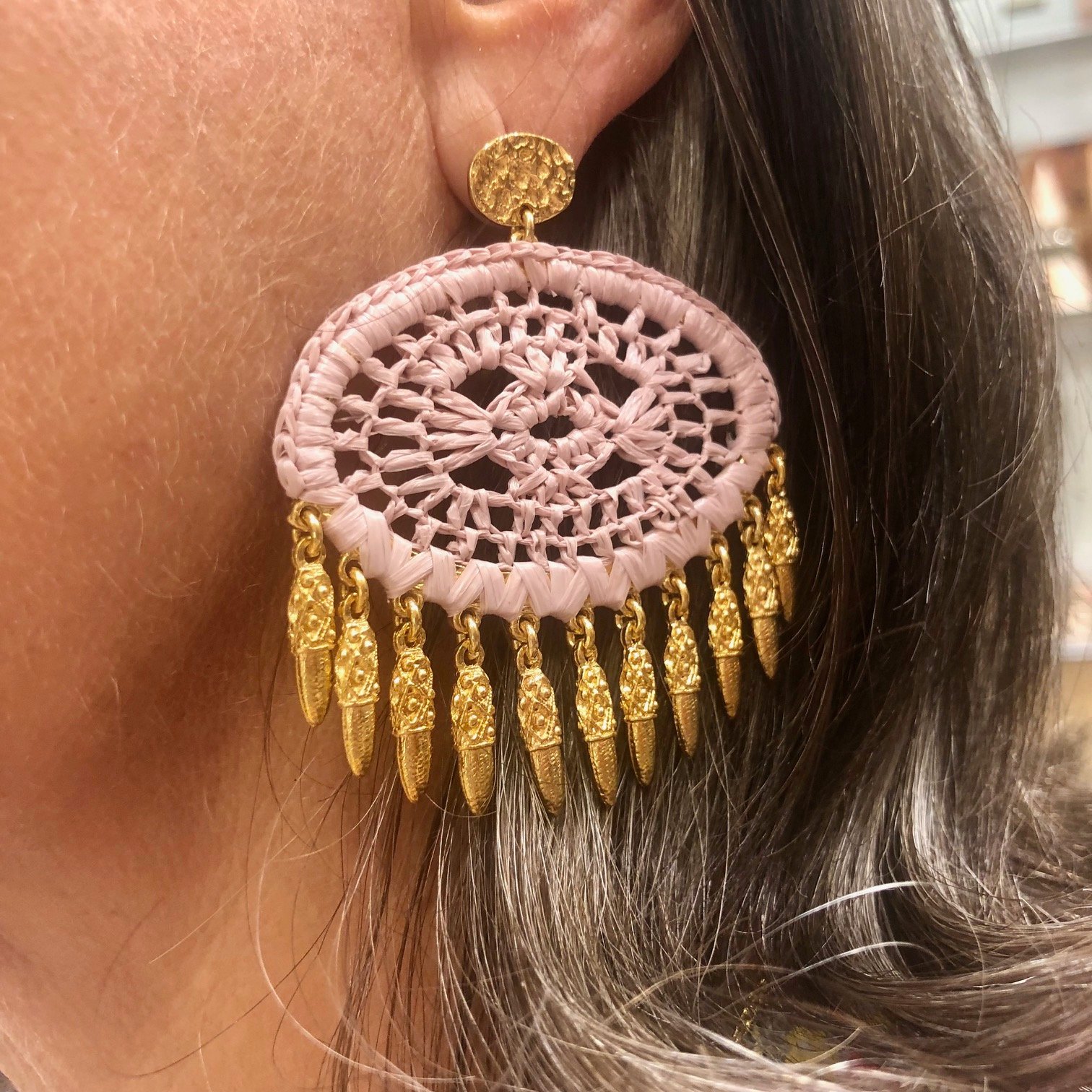 Boucles d oreilles dorées à l or fin 24 carats, composées d’un motif finement crocheté en raphia rose et ornées de multiples pampilles dorées.