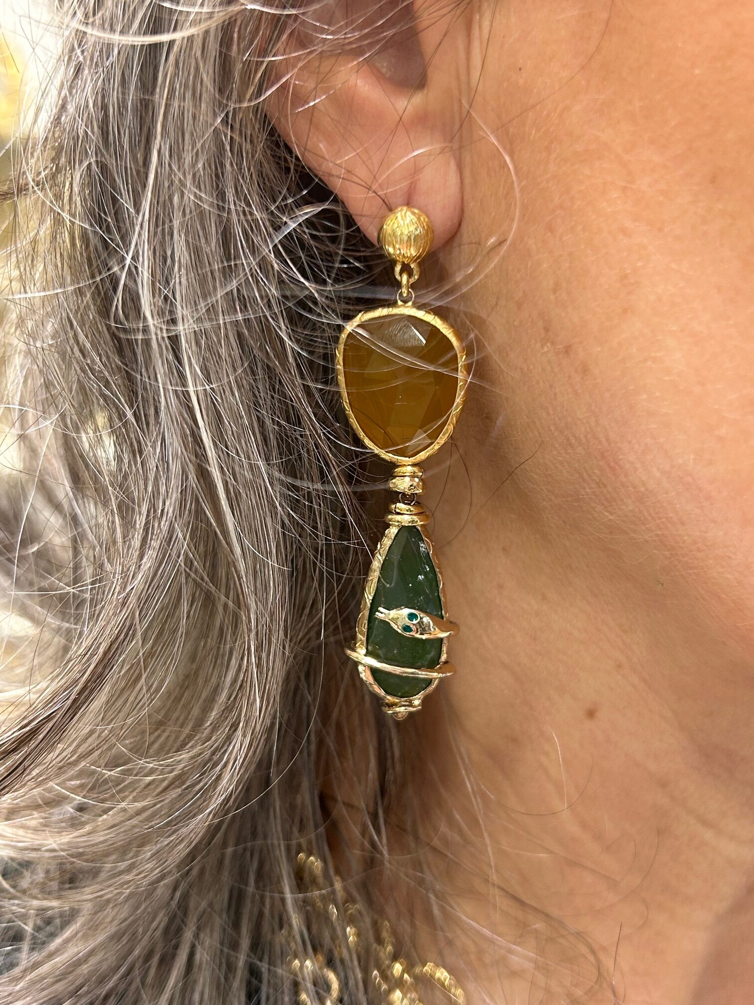 La serpentine apporte une teinte subtilement verte. Elle s’enlace dans une forme évoquant un cobra, détail emblématique qui renforce le caractère audacieux du bijou. De plus, l’ensemble conserve une finesse remarquable, grâce à des finitions précises. Ces matériaux s’unissent pour créer une esthétique singulière, à la fois solaire et mystique.