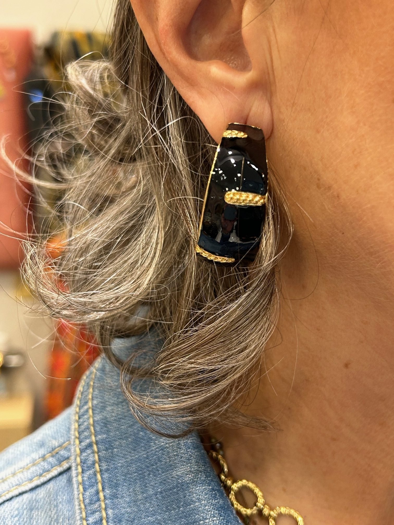 Boucles d’oreilles créoles dorées à l or 24 carats, habillées d’ornements dorées émaillées en noir.