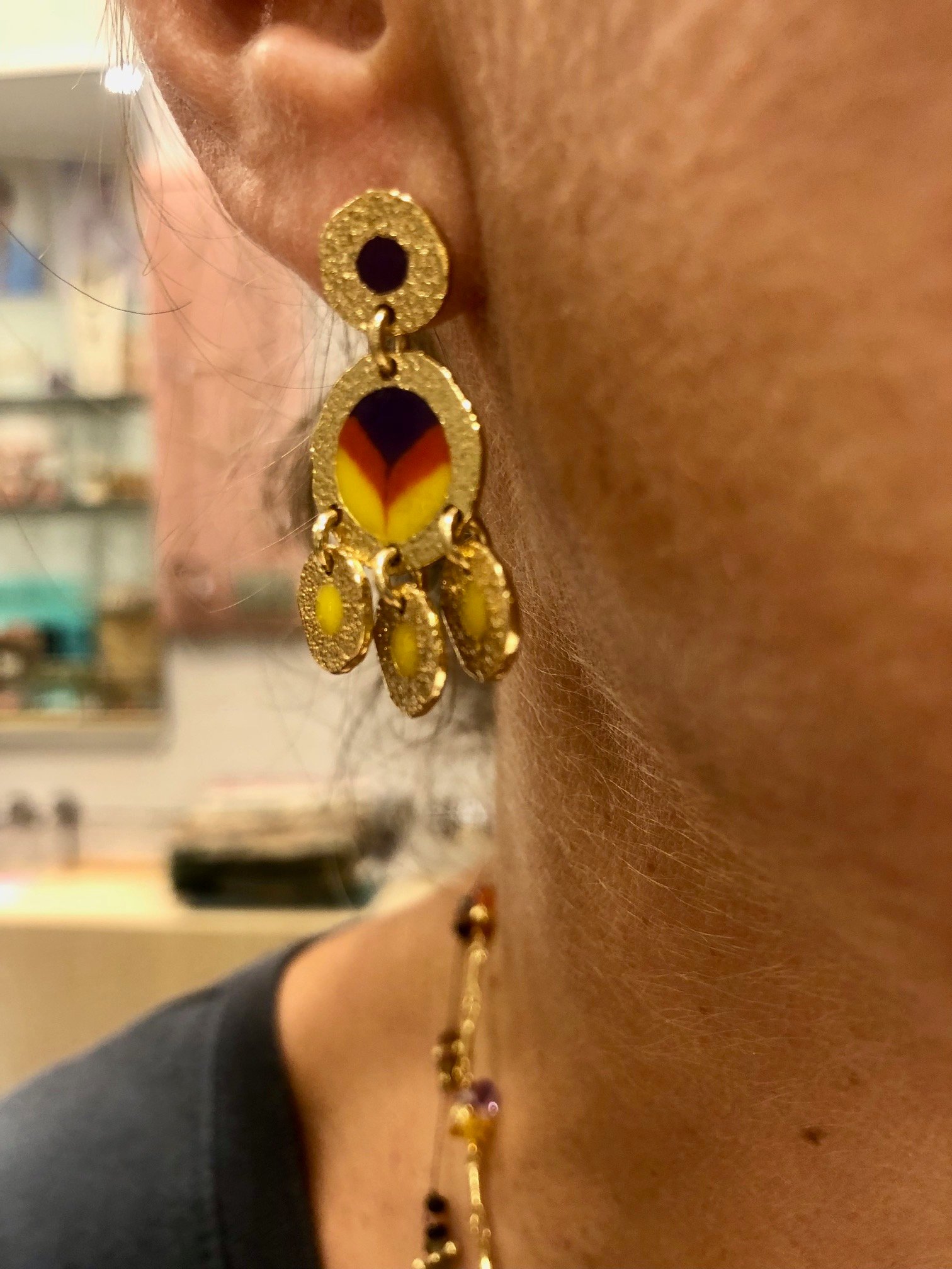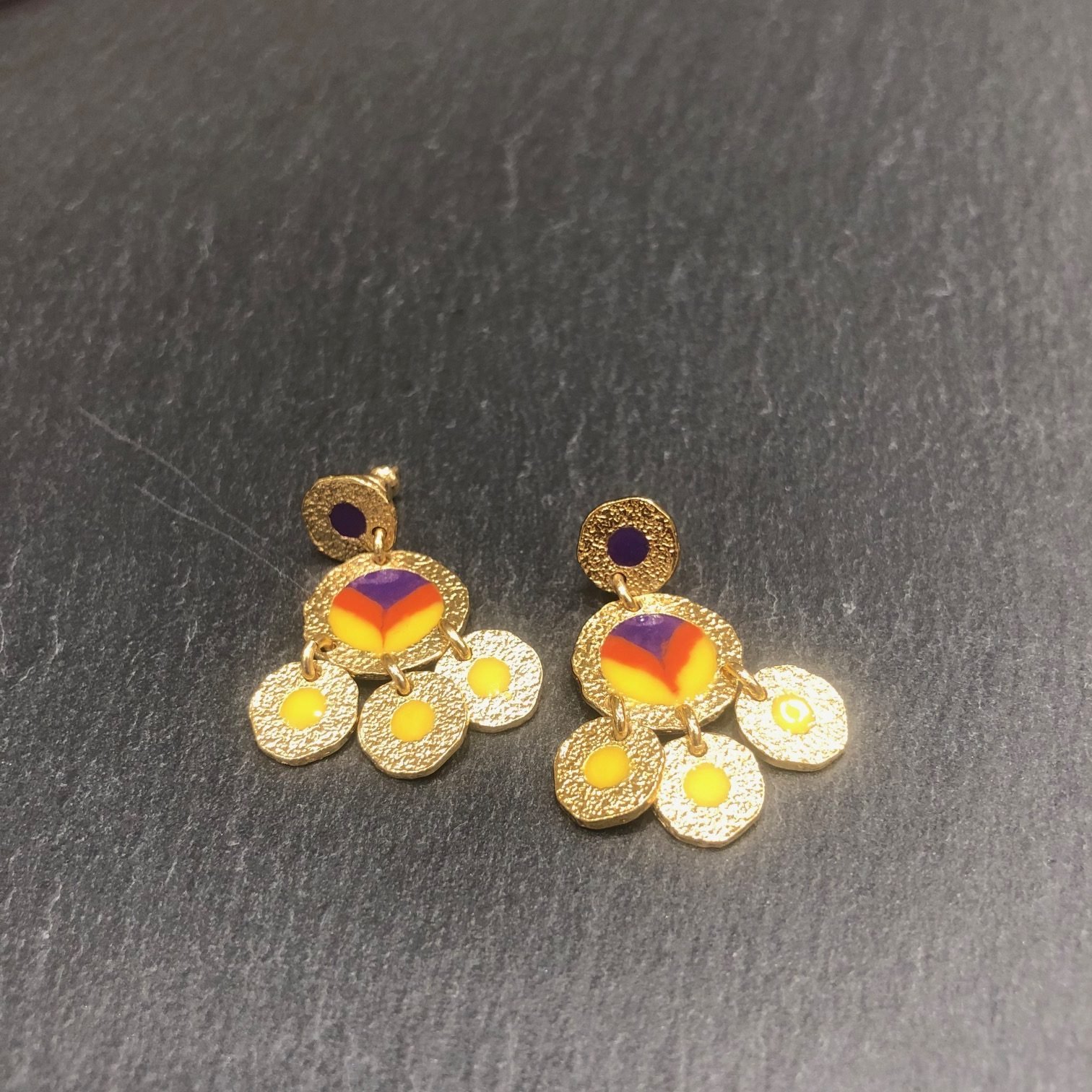 Boucles d’oreilles dorées à l’or fin composées de 2 rangs de sequins motifs peints et émaillés violet, orange, jaune.