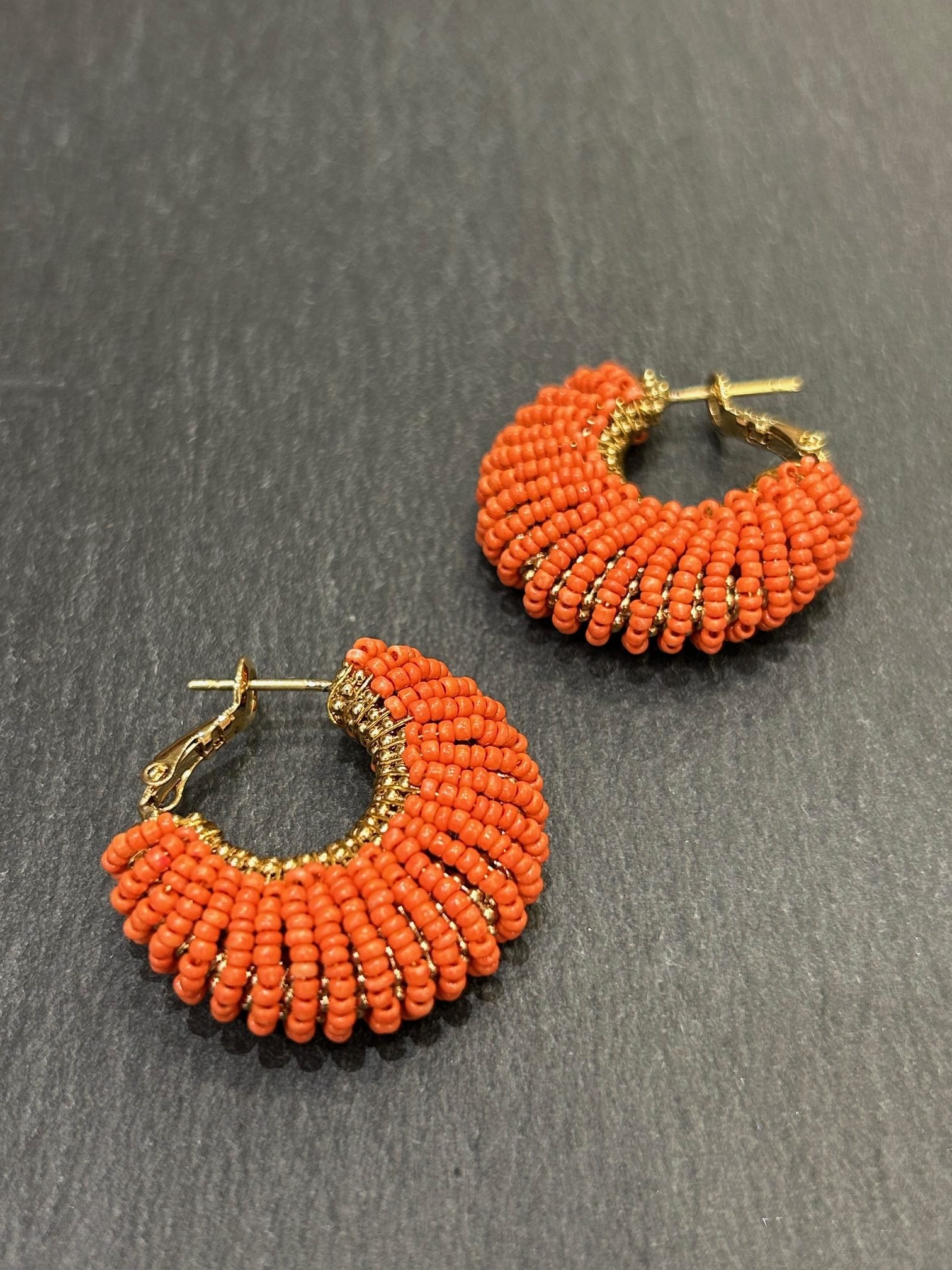 Boucles d’oreilles créoles en métal doré à l’or fin, emperlées de perles de rocaille orange.