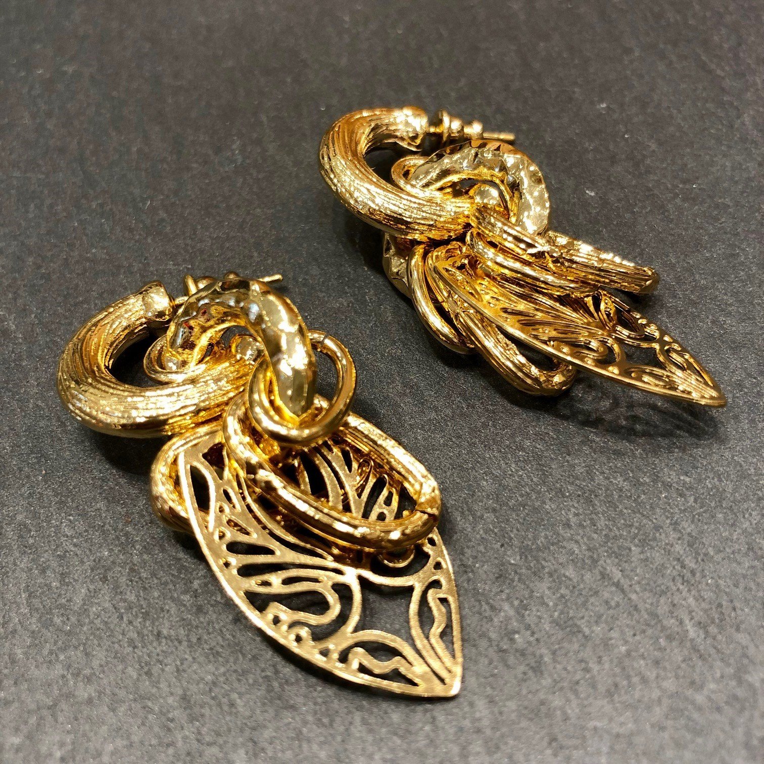 Boucles d’oreilles dorées à l’or fin, formées d’une créole suivie d’un assemblage d’anneaux et d’une délicate feuille dentelée.