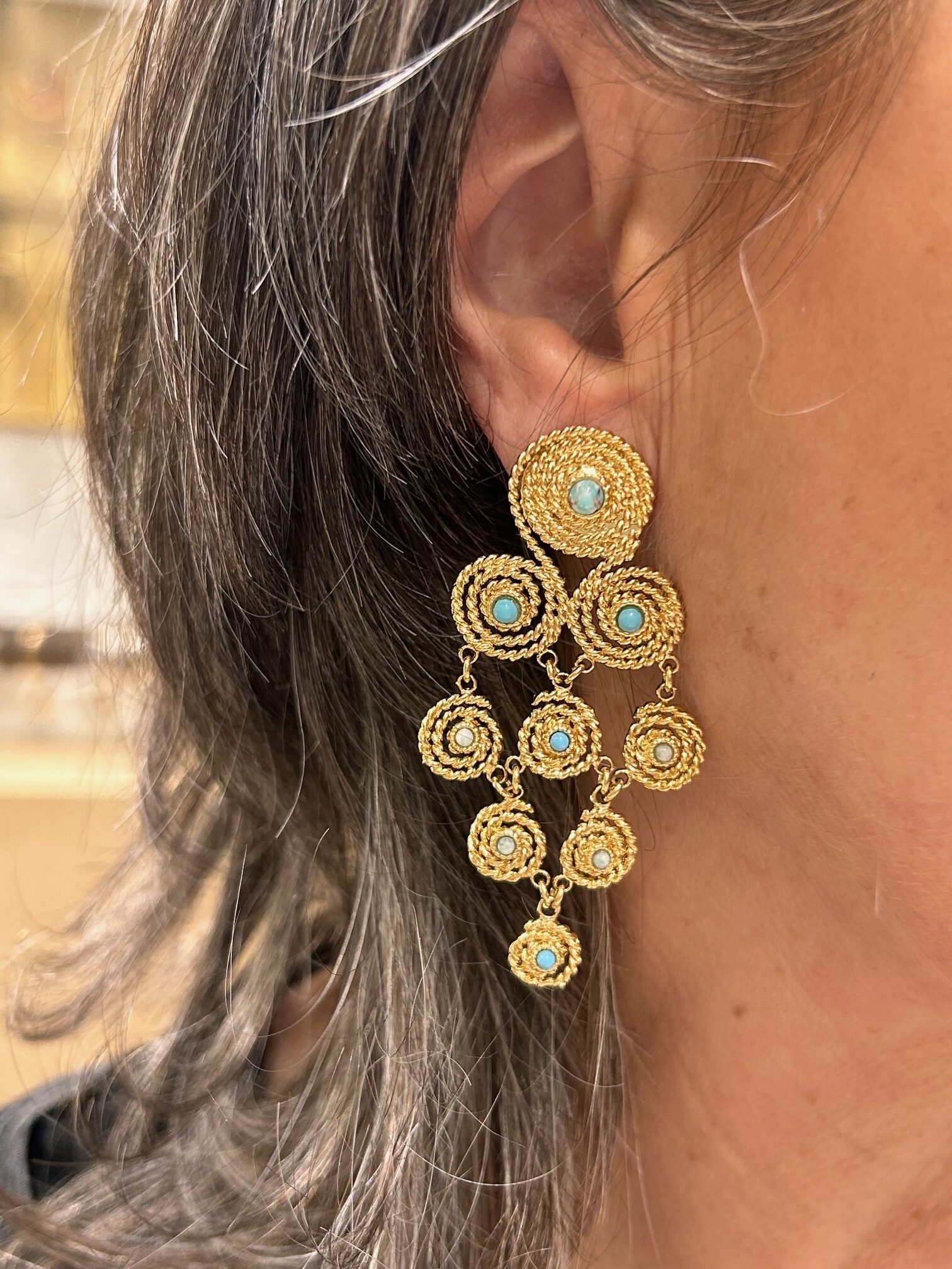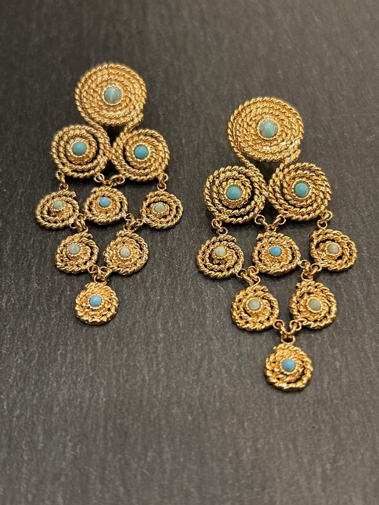 Les boucles d’oreilles turquoise Mistral incarnent une élégance solaire et affirmée. Dès le premier regard, leur design capte la lumière. Ainsi, elles illuminent naturellement le visage. Chaque pièce dévoile un assemblage délicat de formes rondes. Les spirales torsadées créent donc un mouvement subtil et raffiné.
