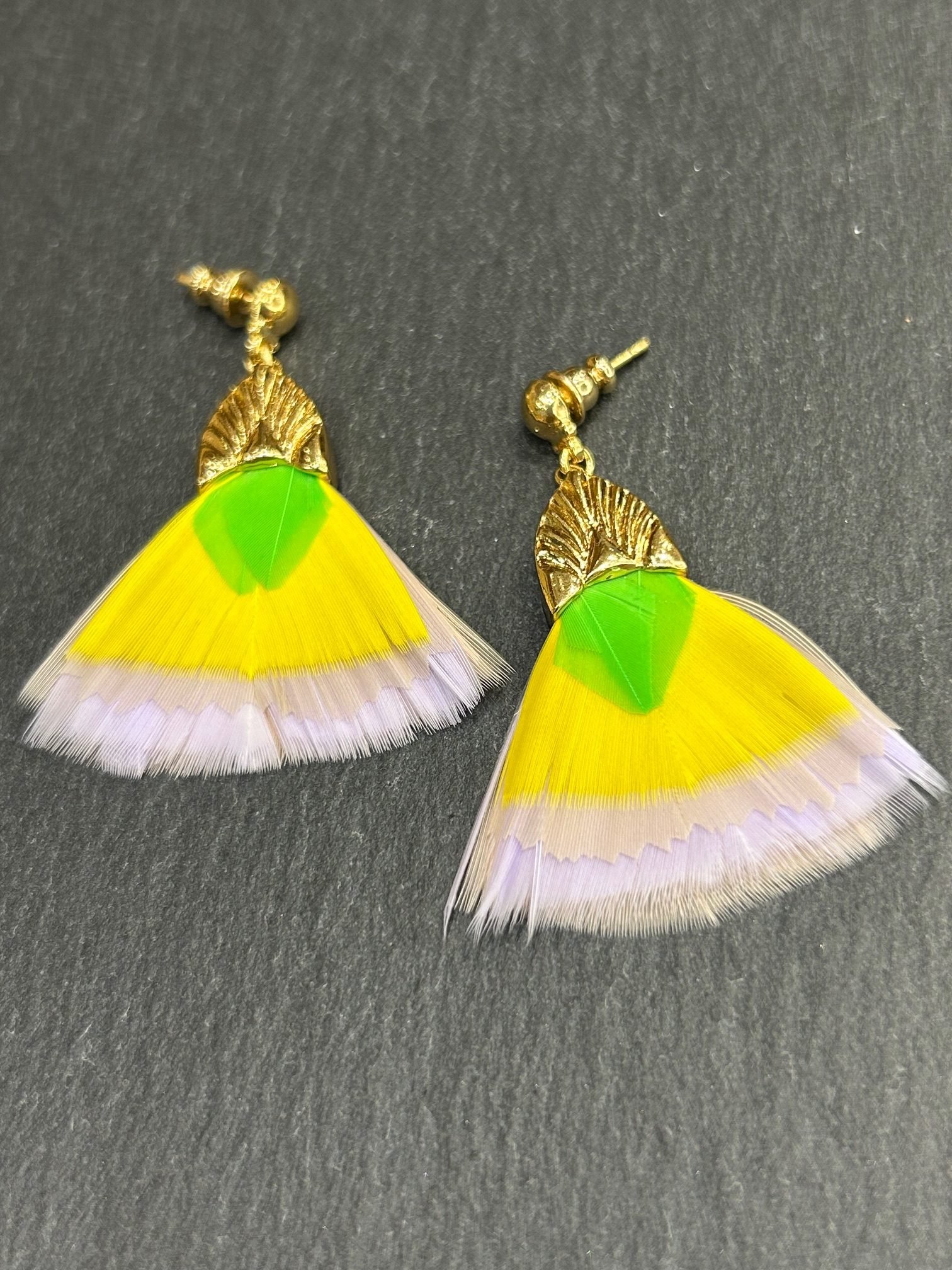 Boucles d’oreilles doré à l or 24 carats, composées d’un assemblage en dégradé de plumes colorées mauve, jaune, vert.