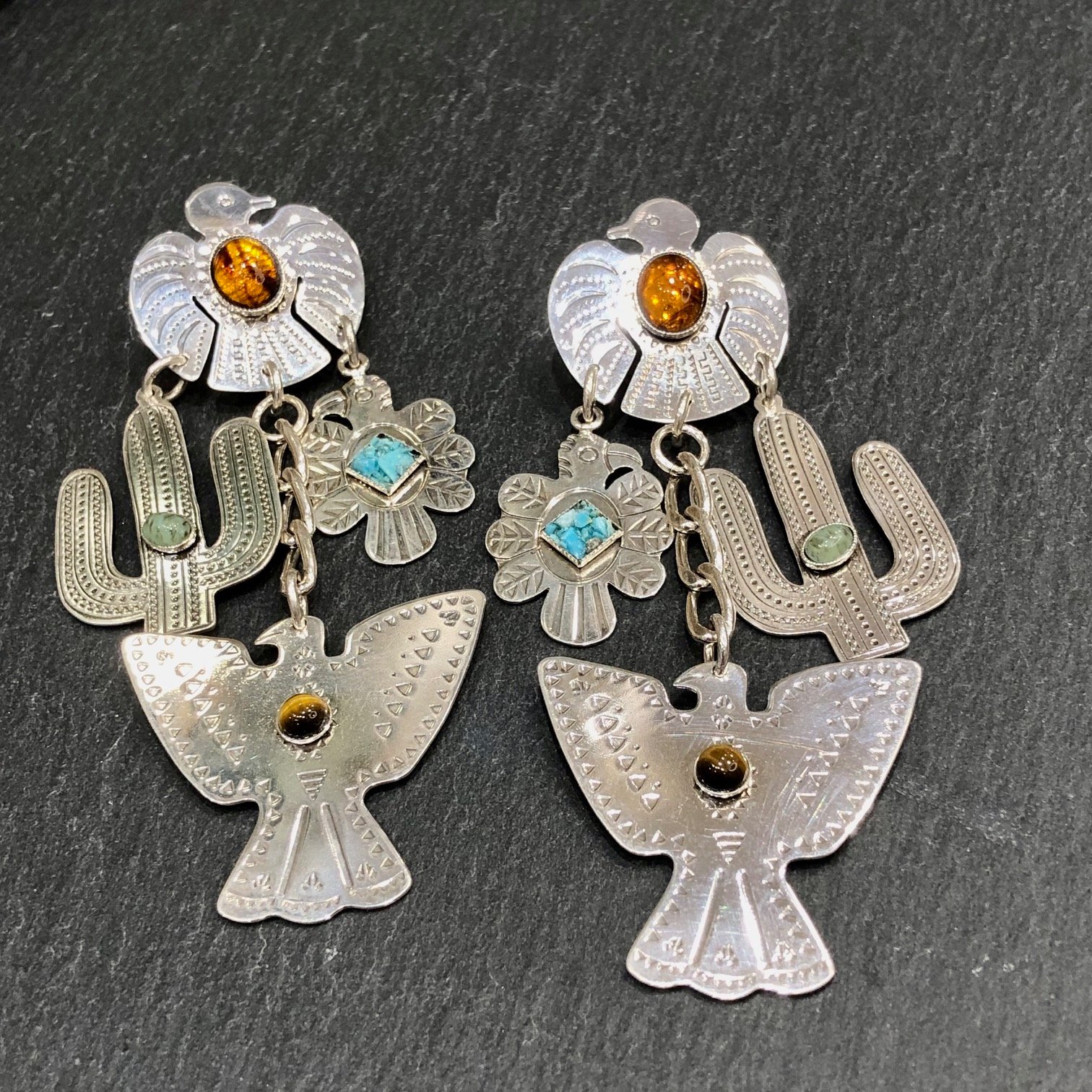 Boucles d’oreilles en métal argenté, ornées de pampilles cactus, aigles cabochon en turquoise, oeil de tigre et perle de verre.