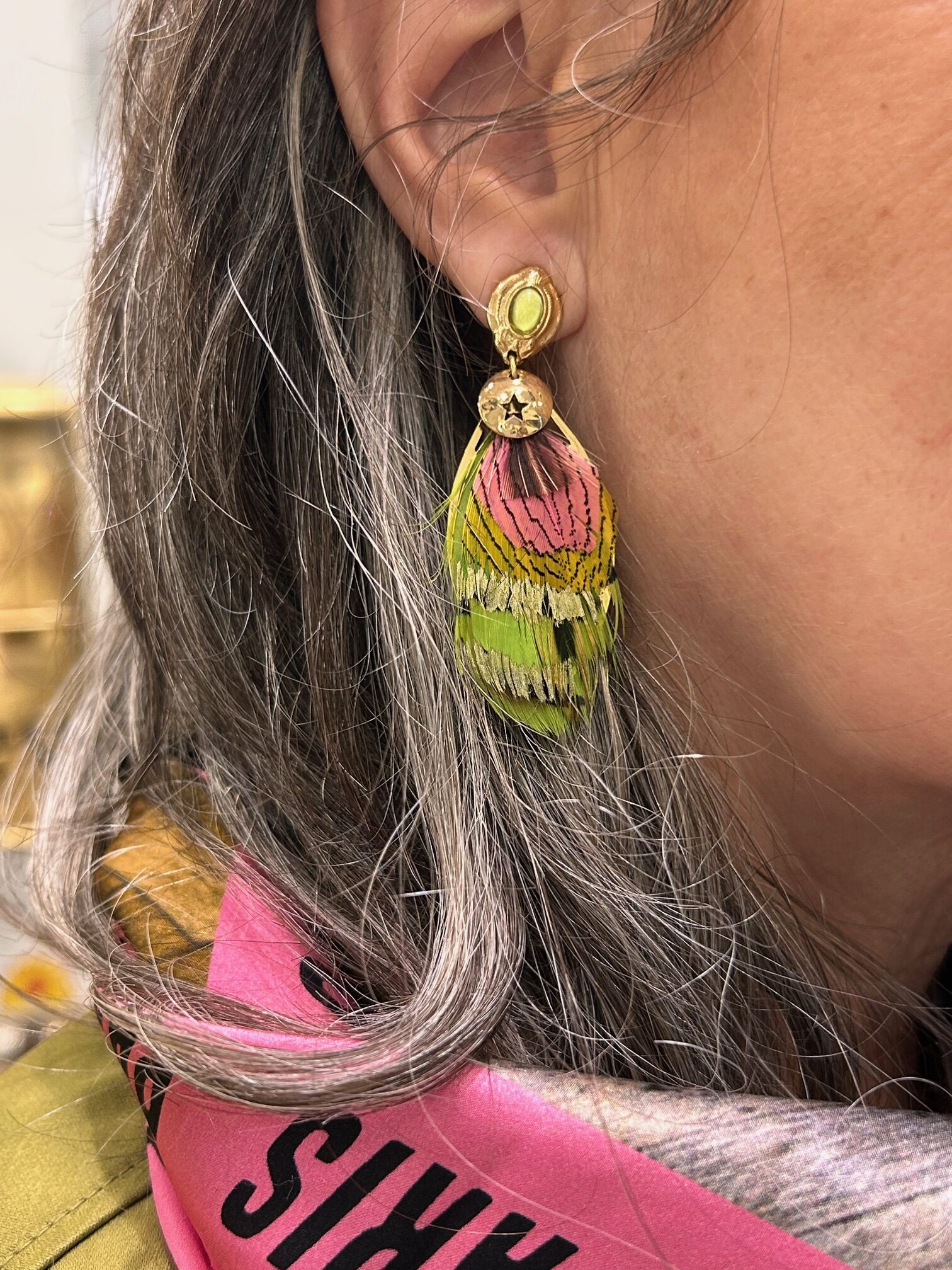 Le plaqué or apporte une brillance chaleureuse. Il capte la lumière sans excès. Les plumes, teintées d’anis et de rose, créent un contraste doux et vibrant. Ainsi, la couleur illumine le teint avec finesse. La longueur de 6,4 cm affine la silhouette. La largeur de 2 cm reste élégante et légère. Cependant, la présence visuelle demeure forte. Le bijou affirme un style sans jamais dominer la tenue.