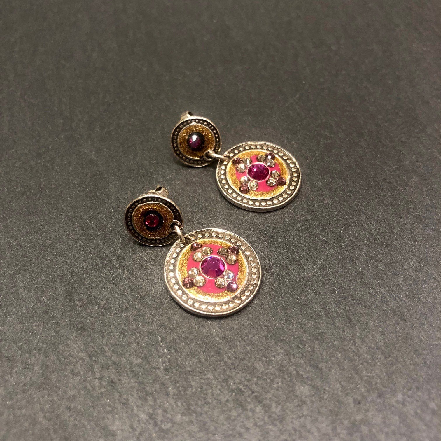 Boucles d’oreilles Sequin 1 rang argentées, émaillées et strassées, coloris beige et rose.