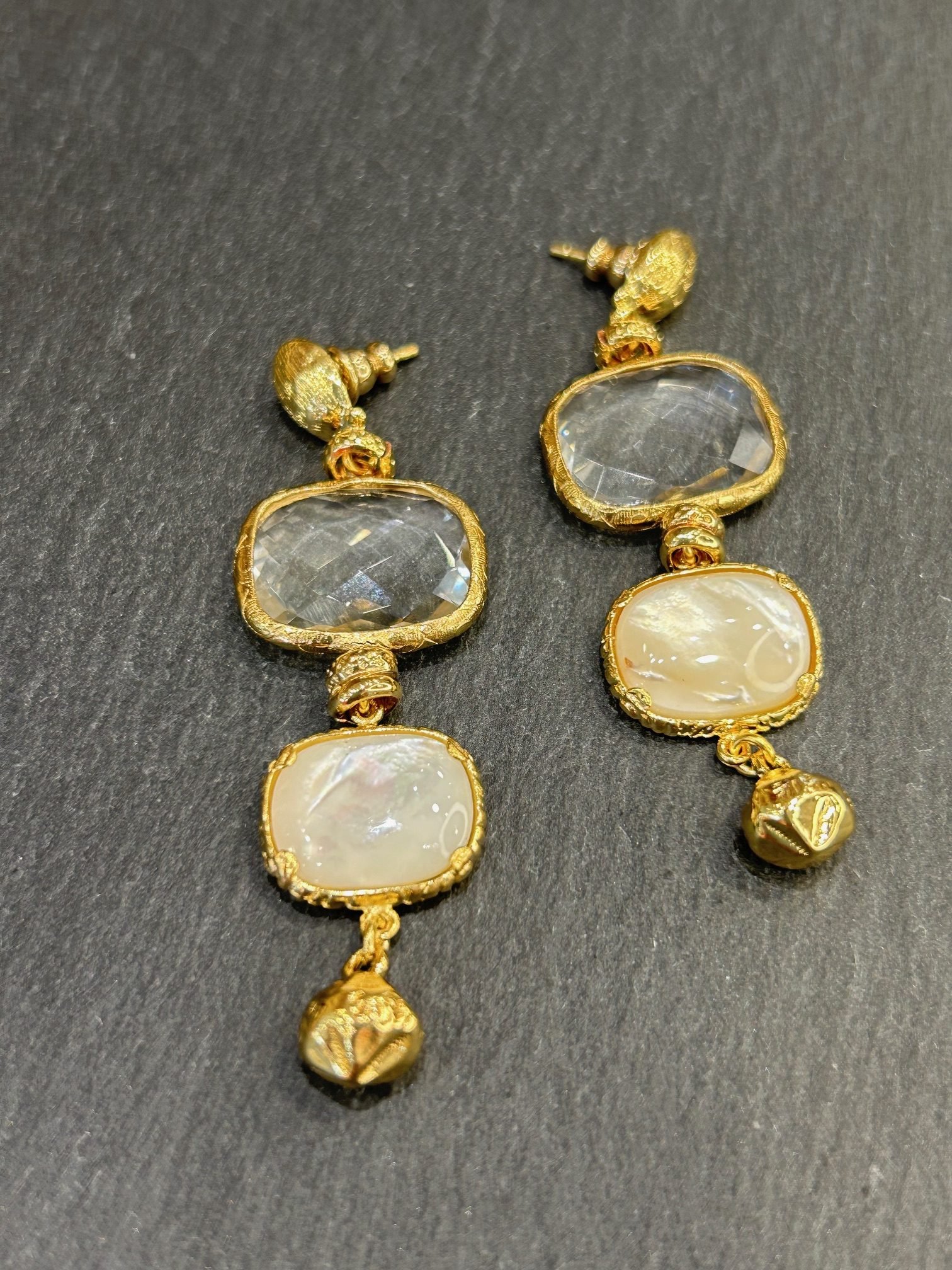 Boucles longues dorées à l’or fin 24 carats composées de 2 délicates pierres semi précieuse cristal de roche et nacre montées sur une puce.