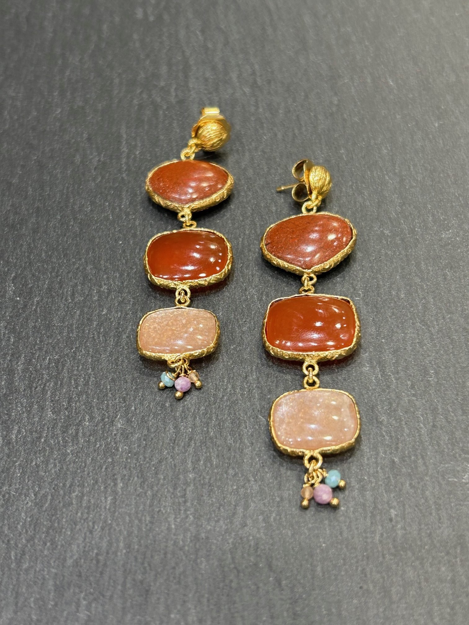 Boucles longues dorées à l’or fin 24 carats composées de trois délicates pierres semi précieuse ,jaspe rouge, cornaline, pierre de soleil montées sur une puce.