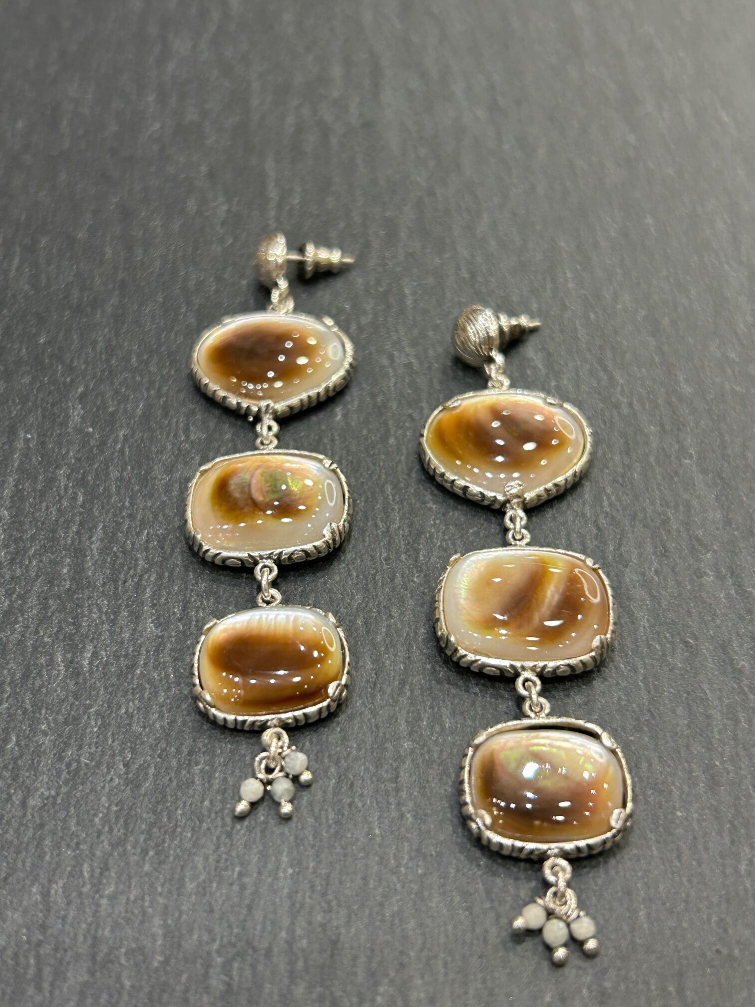 Les boucles d’oreilles nacre grise SILENE signées Gas Bijoux incarnent l’élégance intemporelle et la lumière douce des bijoux d’exception. Conçues pour les oreilles percées, elles se distinguent par une succession de trois pierres de nacre grise serties d’argent 925. Leur silhouette longue et fluide, de 7,8 cm, élance le port de tête avec grâce, tandis que leur largeur de 1,8 cm souligne un équilibre parfait entre finesse et présence.