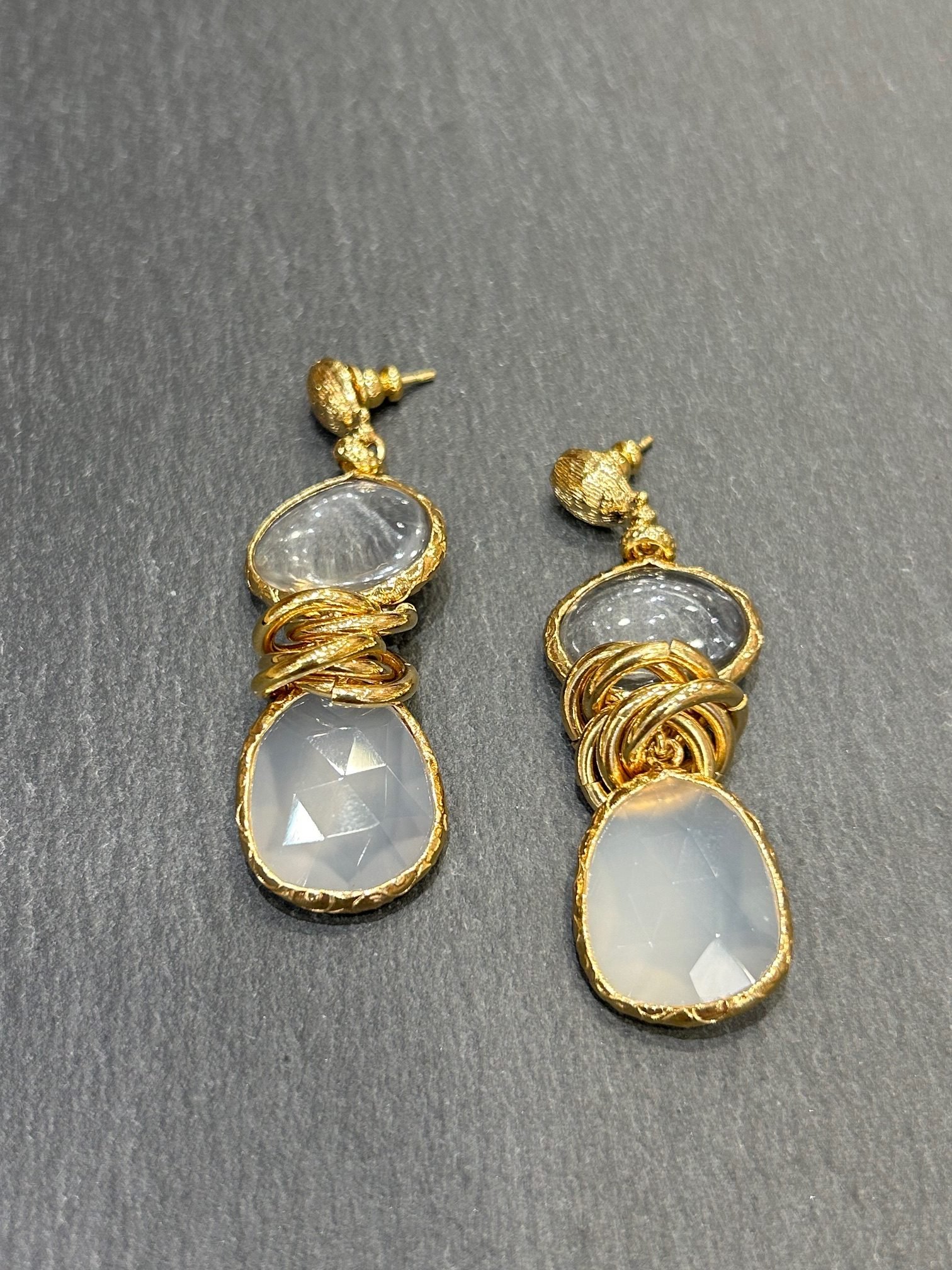 Boucles longues dorées à l’or fin 24 carats composées de deux délicates pierres semi précieuse, cristal de roche et pierre de lune reliées par 5 anneaux montées sur une puce.