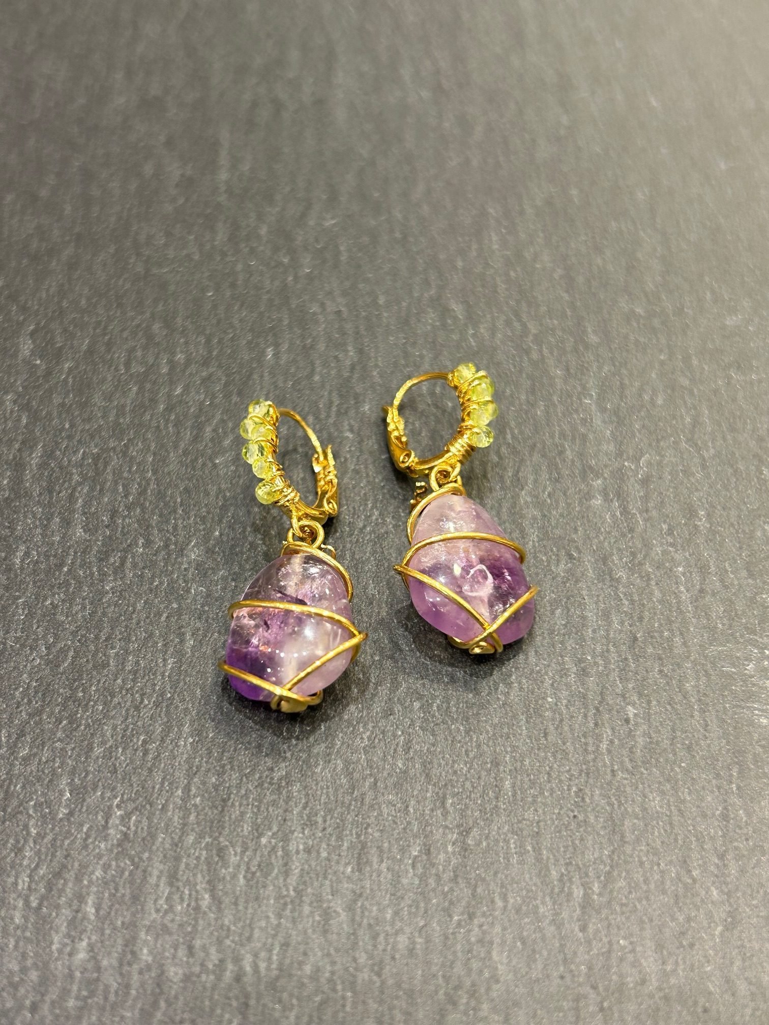Boucles longues dorées à l’or fin 24 carats composées d’une pierre semi précieuse améthyste délicatement emballée dans un fil d’or, montée sur un créoles ornées de pierres fines vertes.