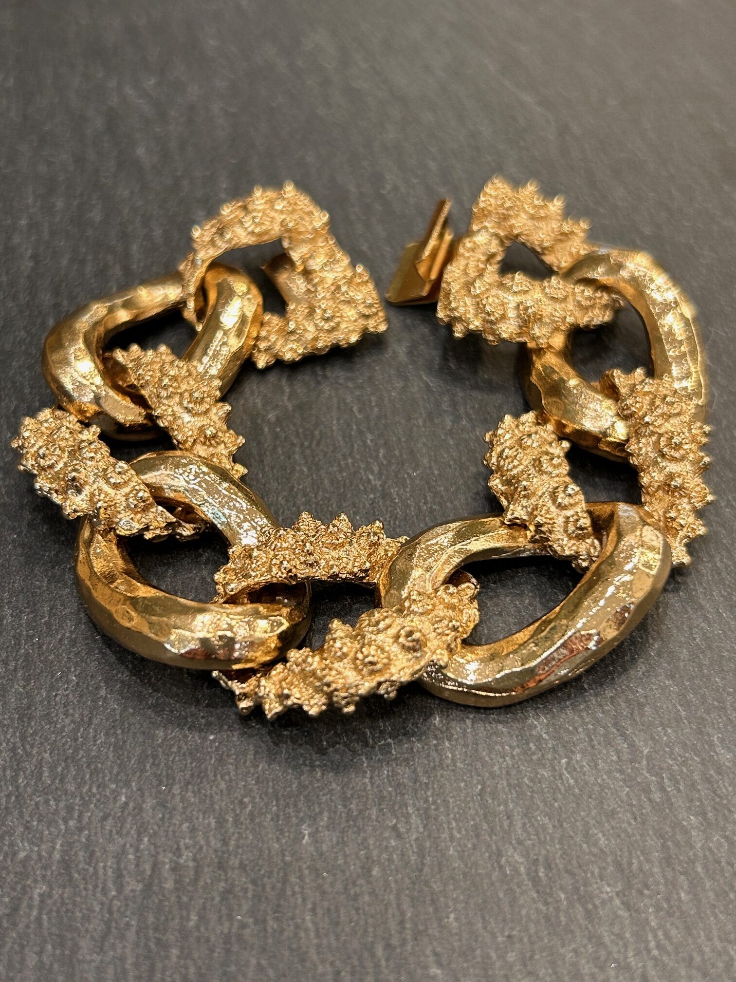 Conçu en étain plaqué or, ce bijou dévoile une brillance chaleureuse et raffinée. De plus, chaque maillon martelé capte délicatement la lumière. Le relief travaillé apporte du mouvement et souligne la richesse de sa texture. Par ailleurs, sa largeur de 2,5 cm affirme une présence élégante sans excès.