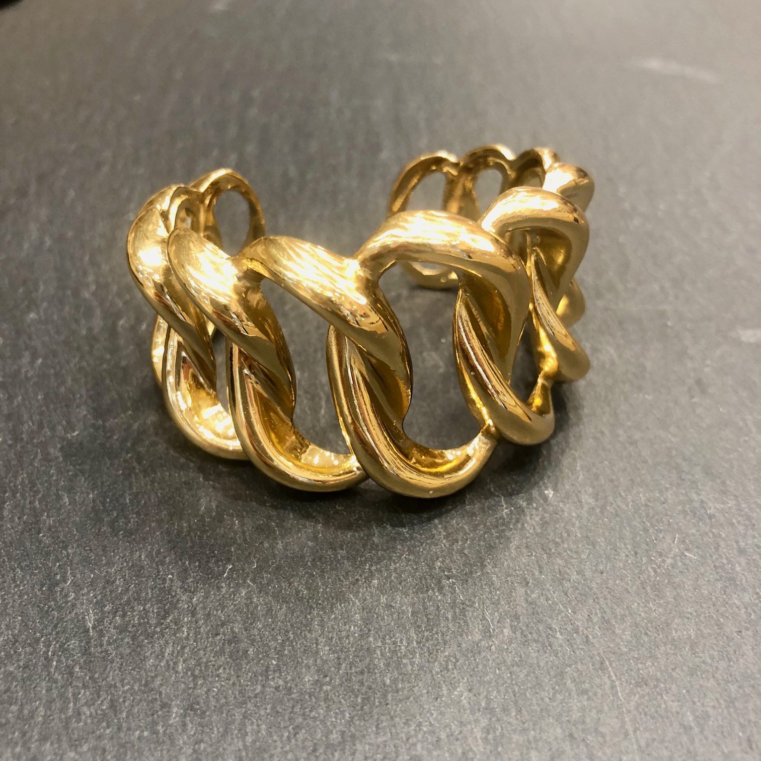 Bracelet manchette rigide en métal doré à l’or fin, composé de maillons entrelacés.