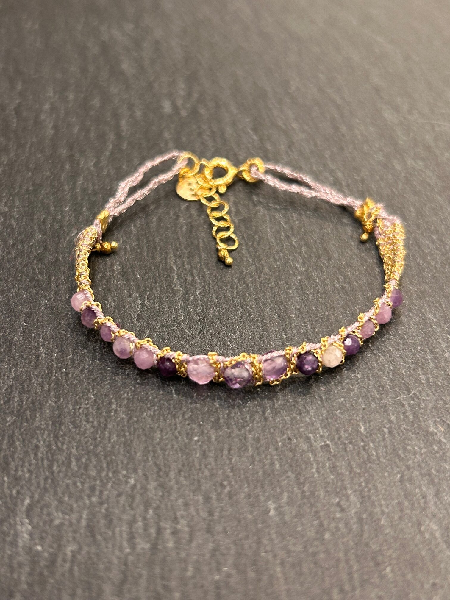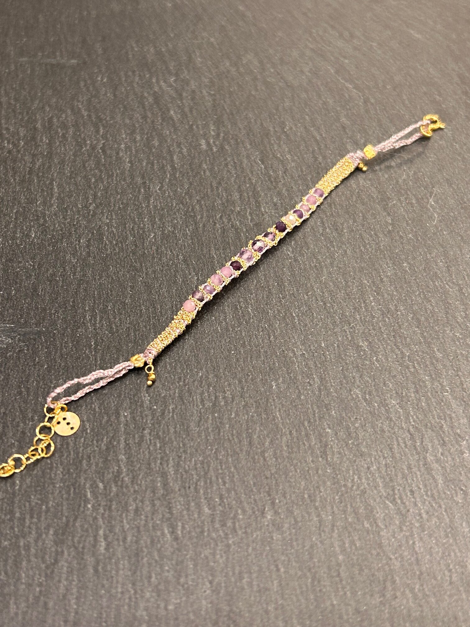 Ce bijou associe l’intensité de l’améthyste à la douceur de la lépidolite. Les pierres révèlent des reflets profonds et apaisants. De plus, leur assemblage met en valeur un jeu de couleurs raffiné. Le tissage en argent plaqué or structure l’ensemble avec finesse. Ainsi, le bracelet conserve une allure sophistiquée malgré sa largeur.