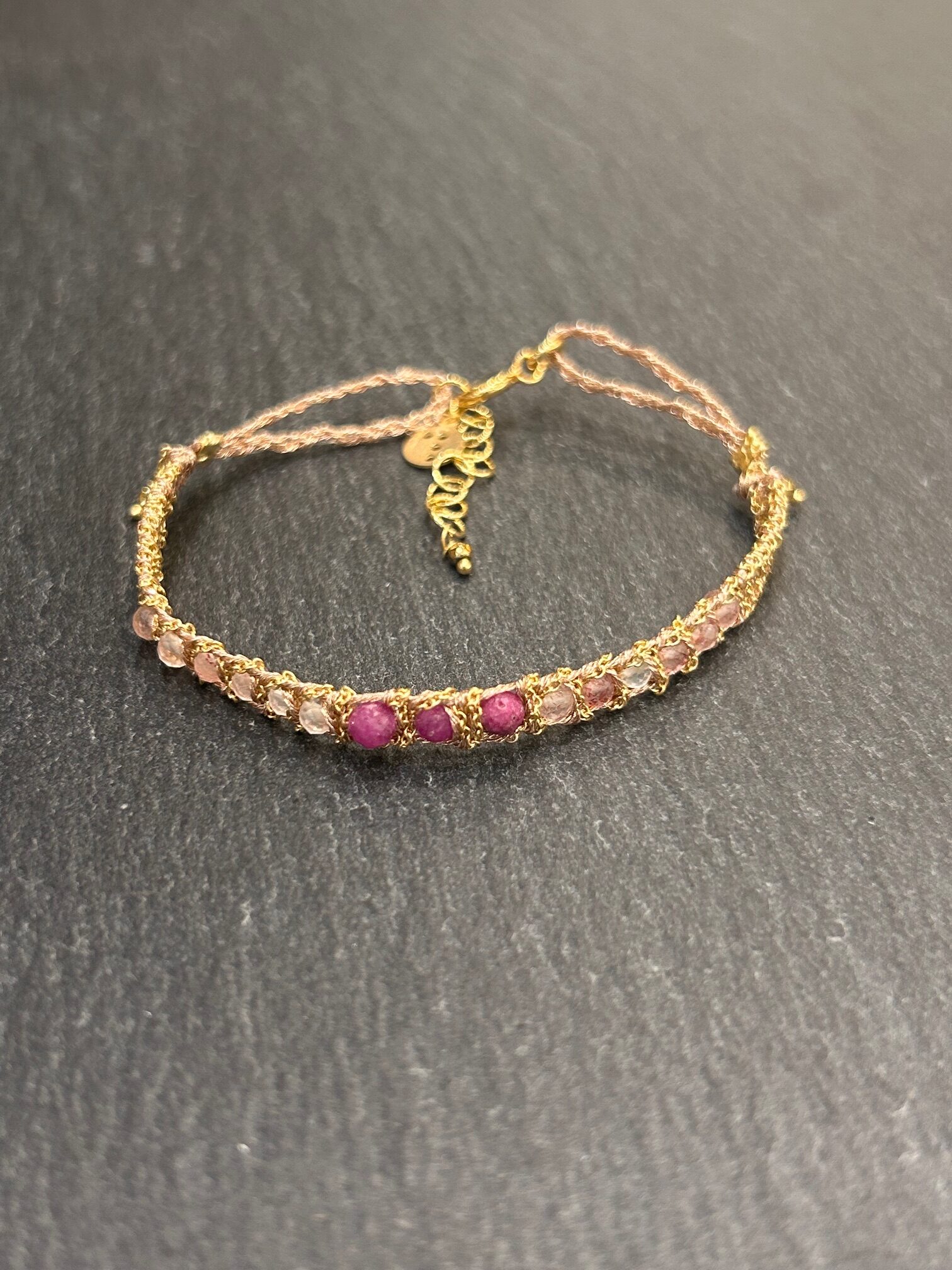 Ce bijou artisanal naît à Milan, berceau du style et du savoir-faire. Les pierres semi-précieuses s’entrelacent avec précision. Le quartz rose diffuse une teinte tendre et apaisante. De plus, la tourmaline rubis apporte une touche plus intense. Par ailleurs, l’argent plaqué or sublime l’ensemble avec une brillance chaude.