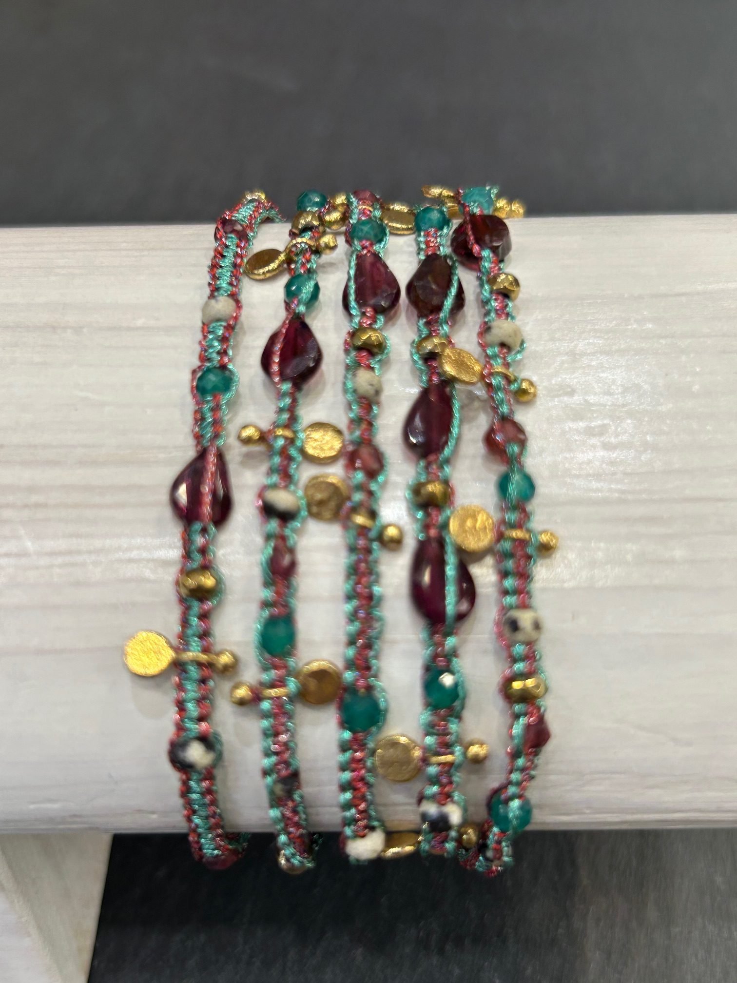 Bracelet, collier multitours macramé en fils lurex avec pierres semi précieuse entrelacées ,jaspe dalmacien, onyx vert grenat, hématites dorées, pampilles,finition laiton plaqué or 24 carats.
