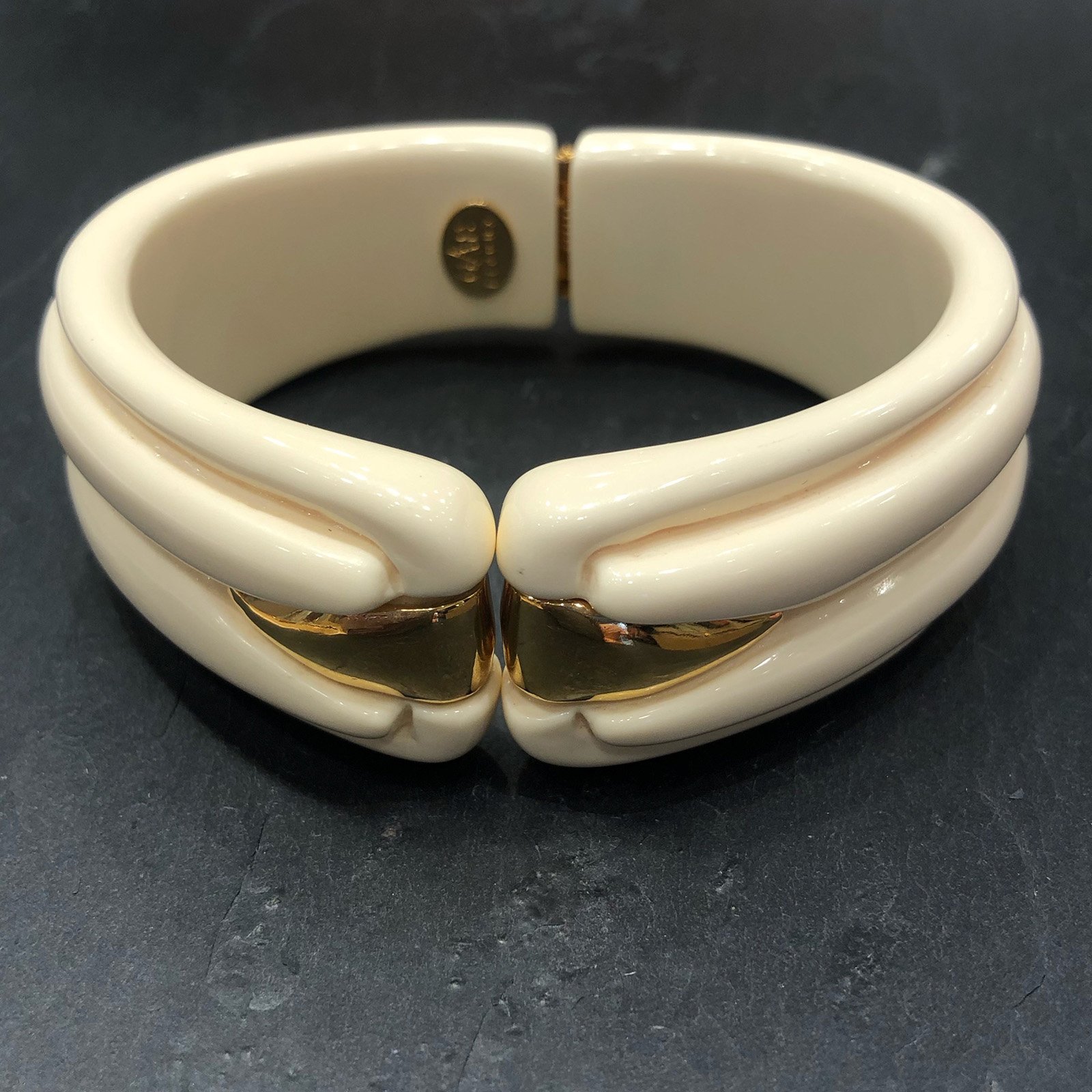 Bracelet en résine, habillé sur le devant d’une fine pièce en métal doré à l or fin 24 carats coloris ivoire