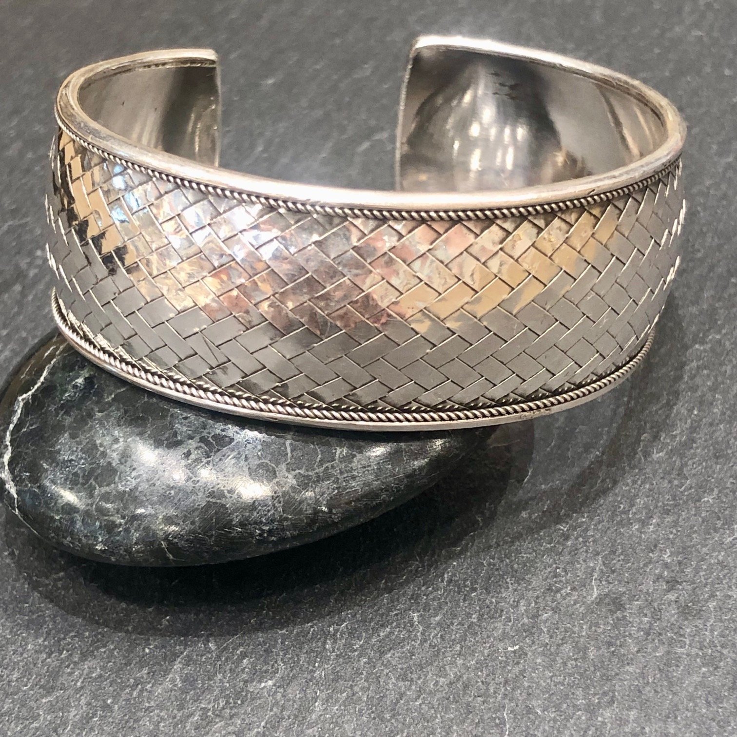 Bracelet rigide manchette ouverte en argent 925, motif tressage.