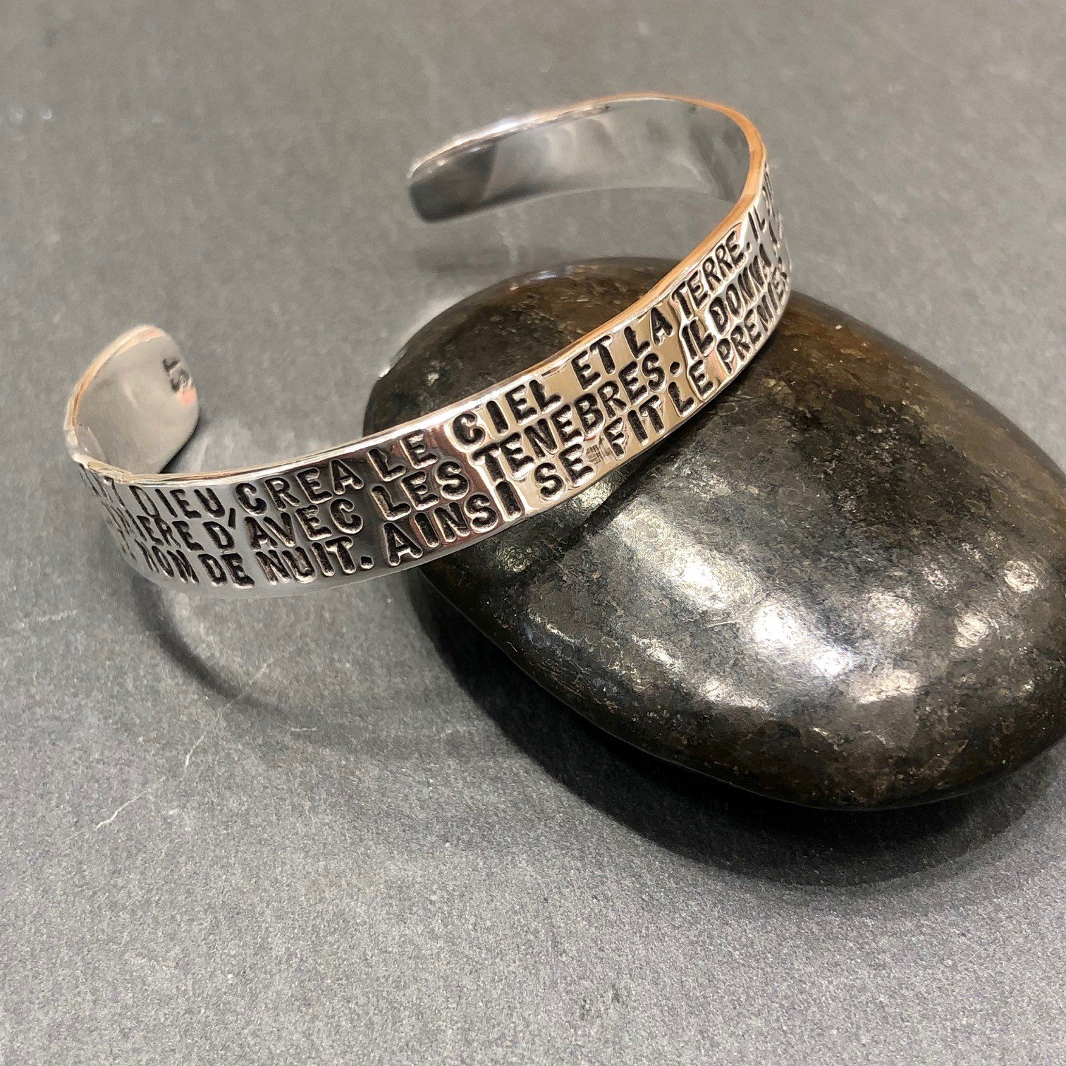 Bracelet ouvert en argent gravé : « Au commencement Dieu créa le ciel et la terre (…) ainsi se fît le premier jour »