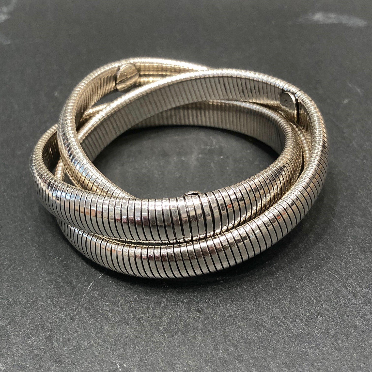 Bracelet 3 rangs argenté composé de 3 joncs souples à la structure élastique. Largeur 3 cm Circonférence 19 cm