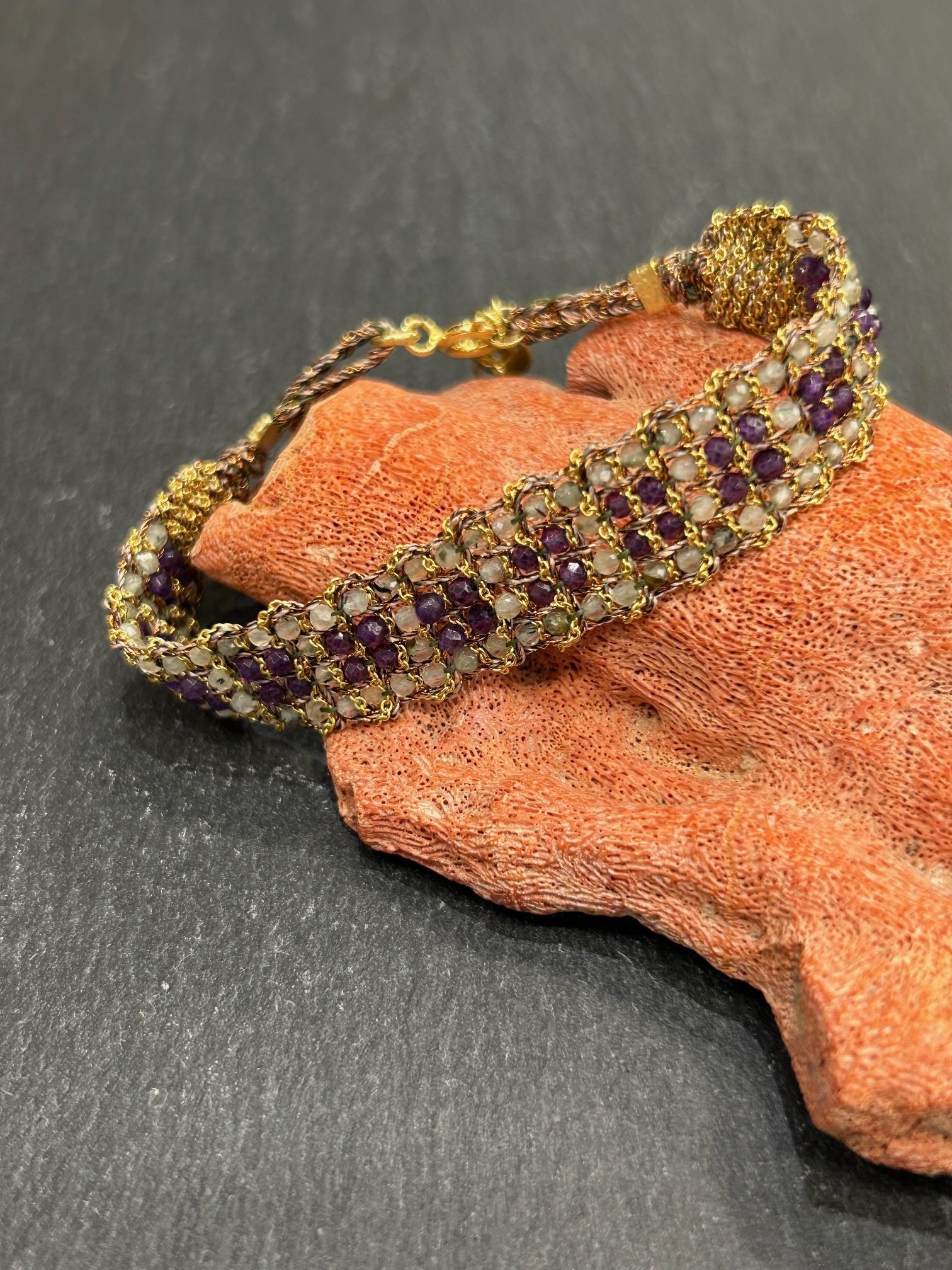 Bracelet tissé en argent 925 paqué or orné de pierre semi précieuse 4 rangs améthyste et prehnite.