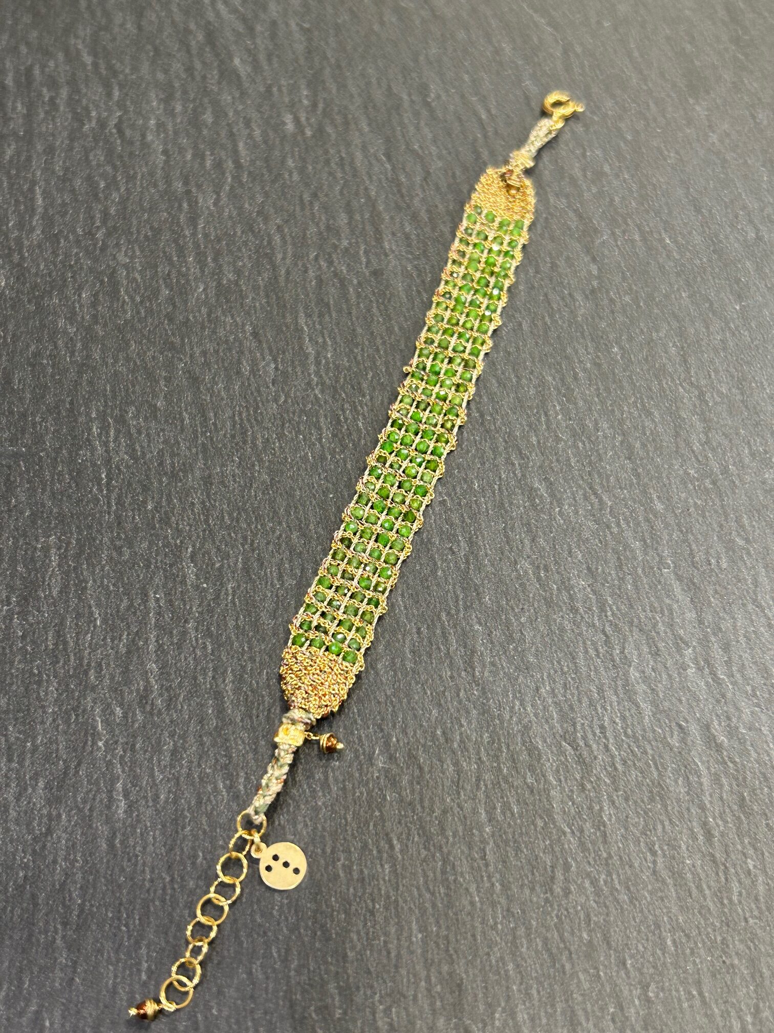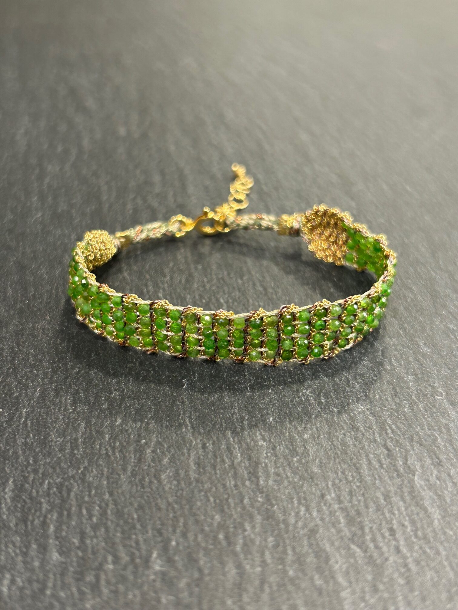 Tissé à la main, ce bracelet se compose de quatre rangs de pierres diopside reliés par de délicats fils en argent plaqué or. Sa structure souple et raffinée épouse le poignet avec légèreté. Grâce à sa rallonge de trois centimètres, il s’ajuste aisément à toutes les morphologies.