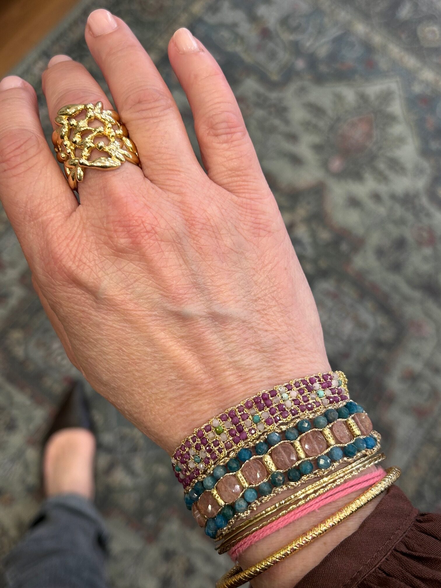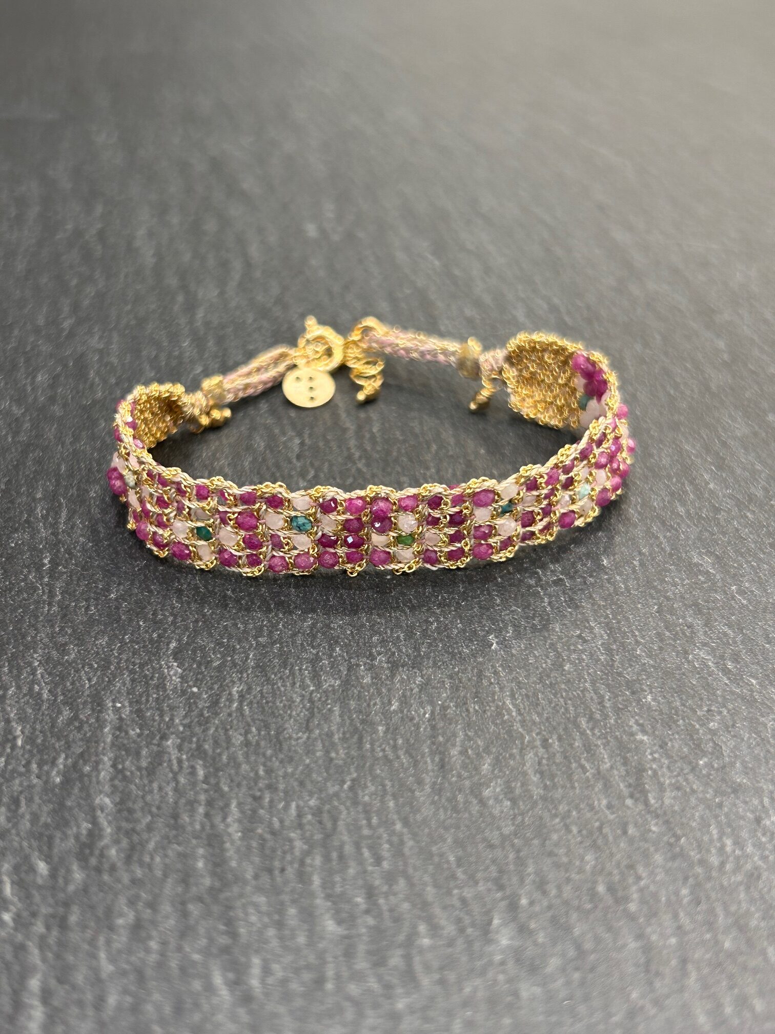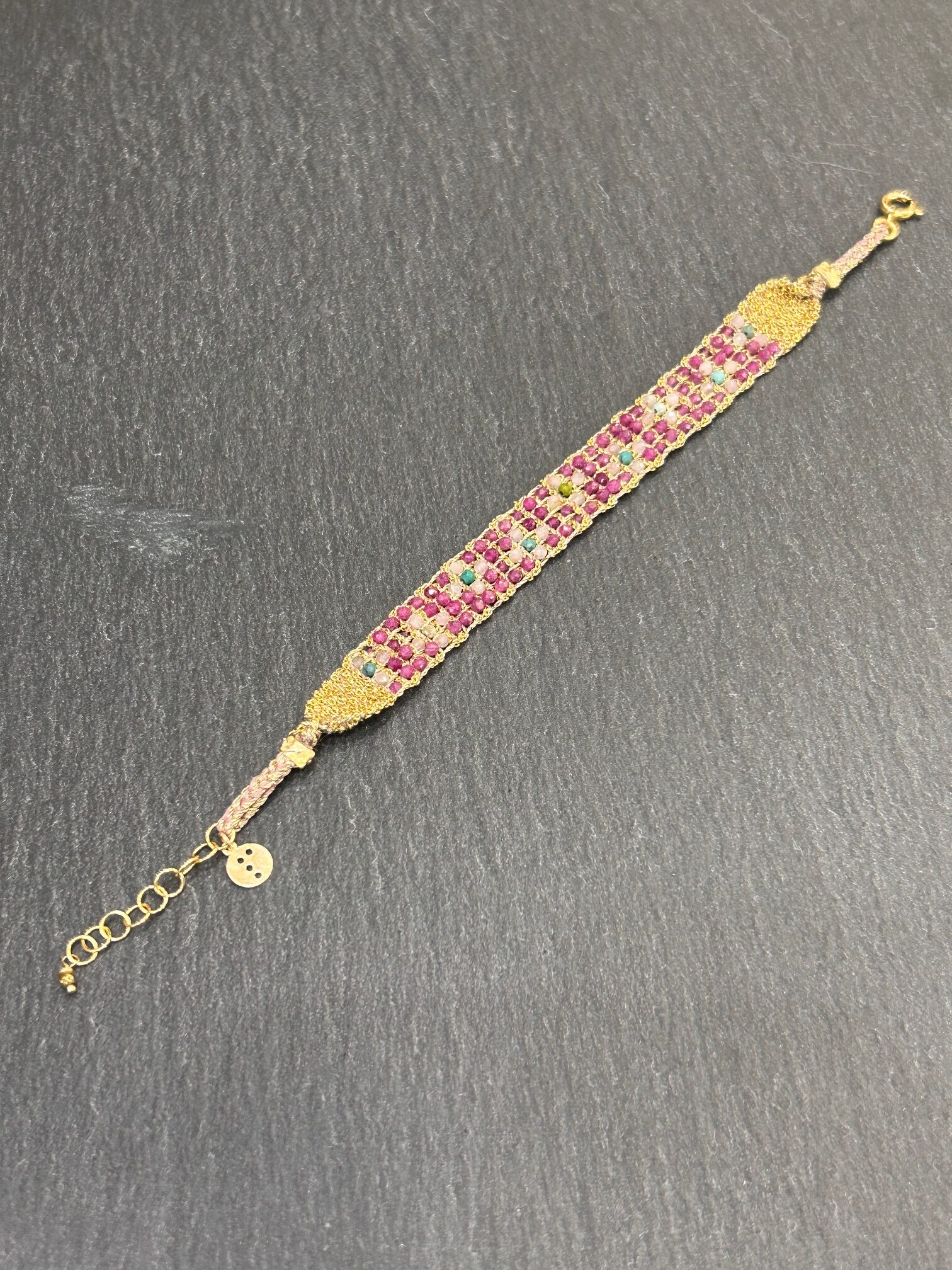 Ce bijou associe l’argent plaqué or à un tissage délicat de pierres semi-précieuses. La tourmaline rubis apporte une touche intense et vibrante. De plus, la kunzite diffuse une douceur lumineuse. La turquoise, quant à elle, évoque des nuances apaisantes et raffinées. Par ailleurs, l’ensemble crée un contraste équilibré et séduisant.