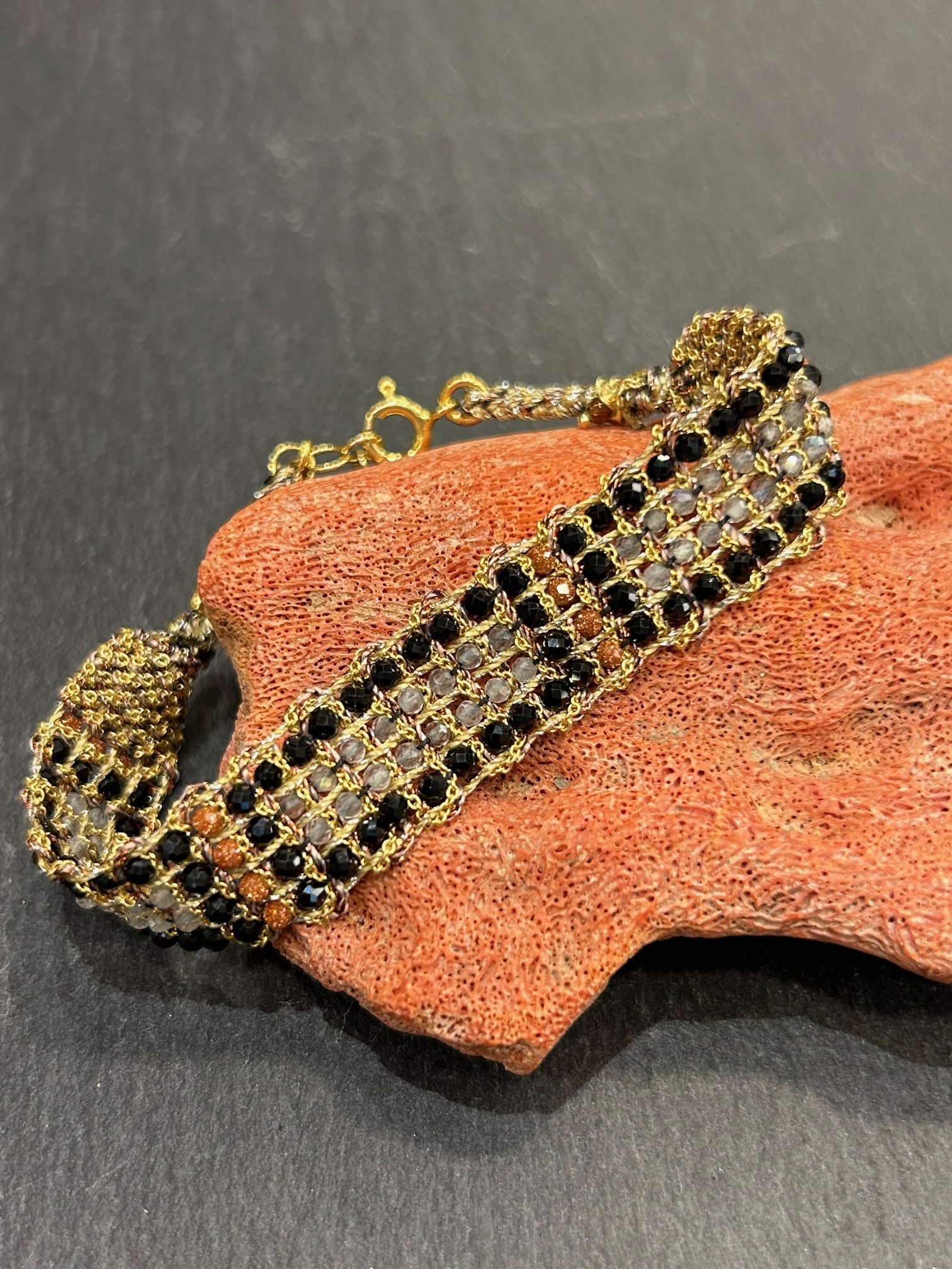 Bracelet tissé en argent 925 paqué or orné de pierre semi précieuse 4 rangs labradorite et spinelle.