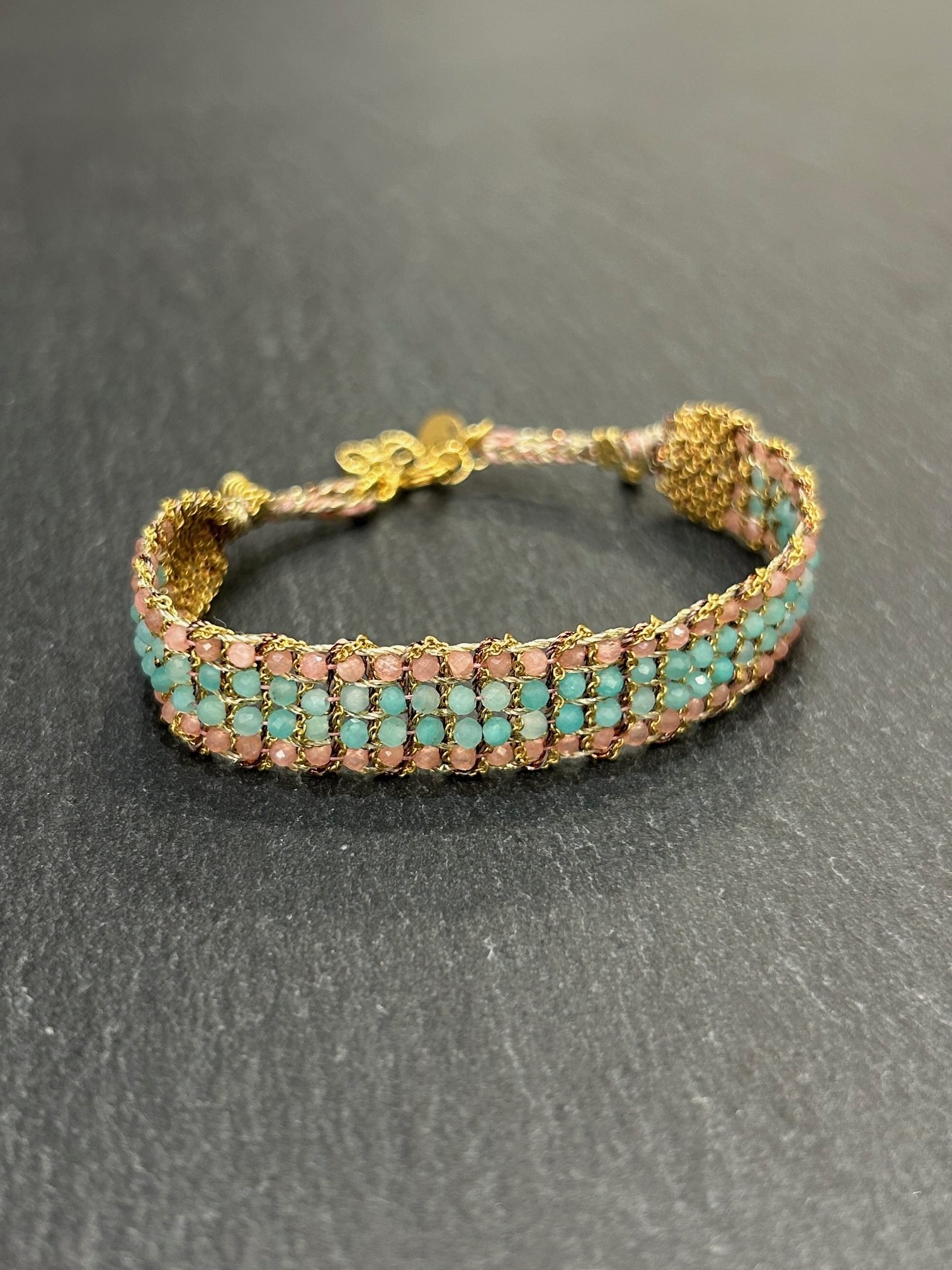 Bracelet tissé en argent 925 paqué or orné de pierre semi précieuse 4 rangs de pierres semi précieuses, rhodonite, amazonite.
