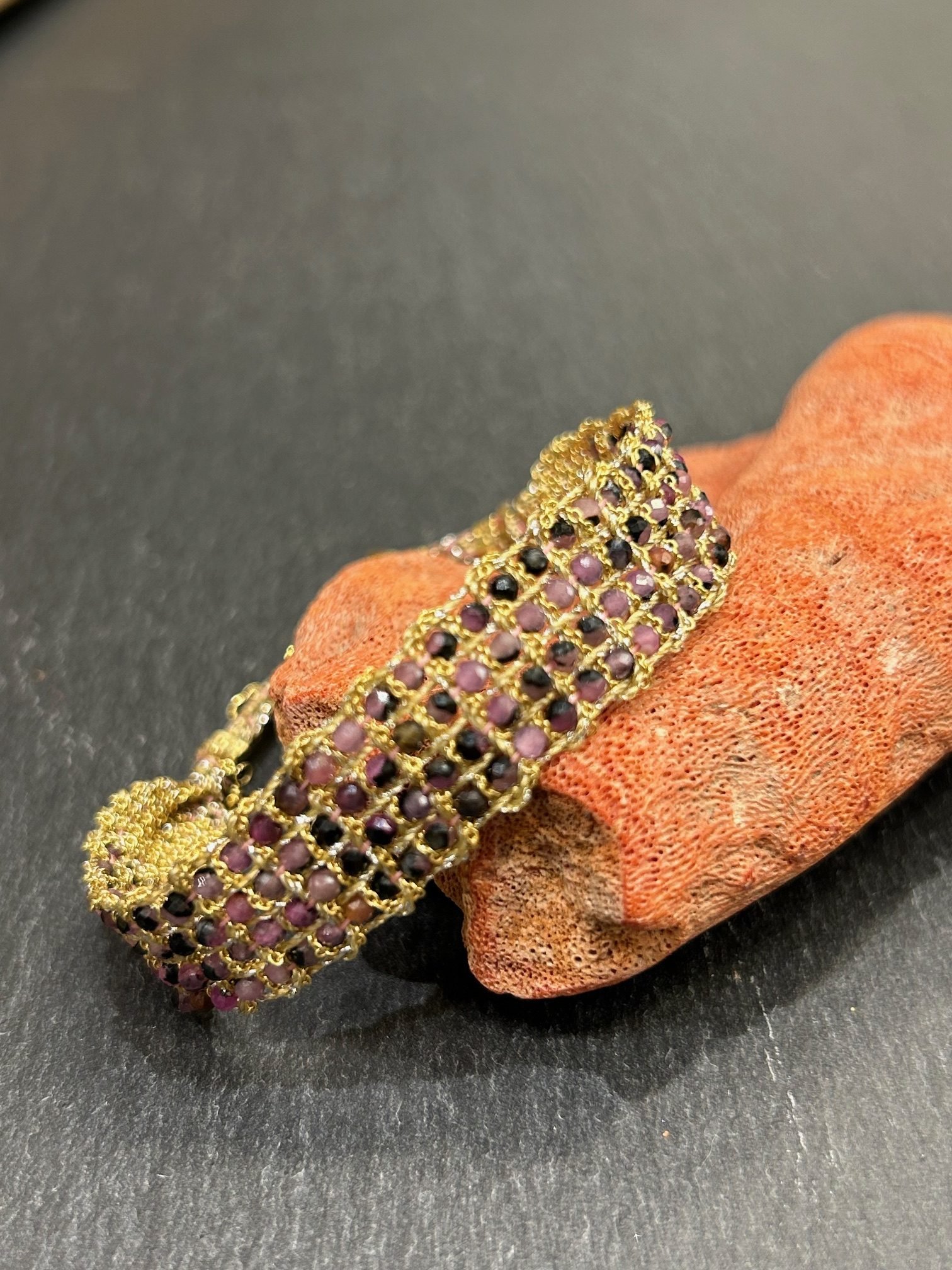 Bracelet tissé en argent 925 paqué or orné de pierre semi précieuse 4 rangs en tourmaline rubis.