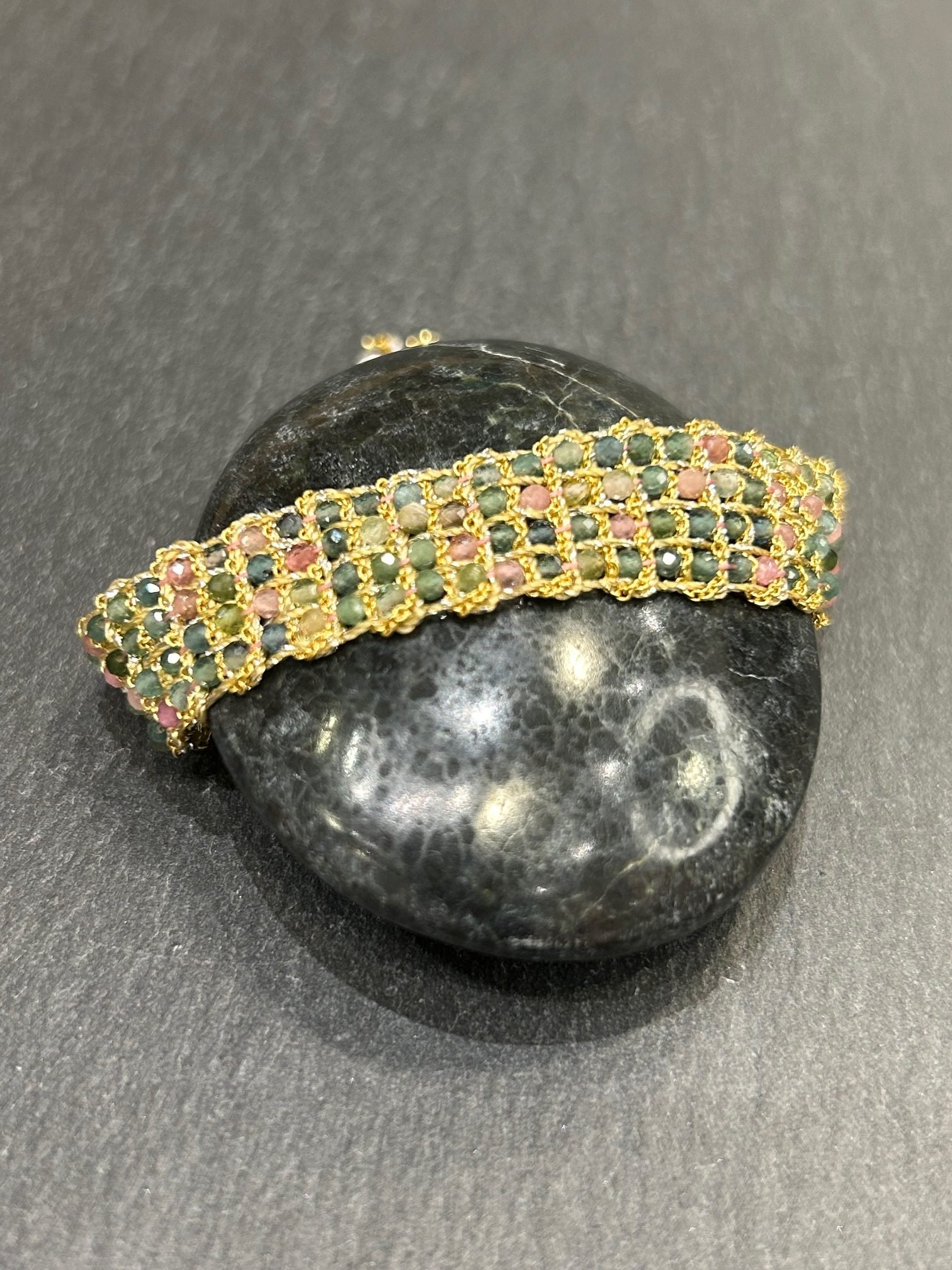 Bracelet tissé en argent 925 paqué or orné de pierre semi précieuse 4 rangs tourmaline.