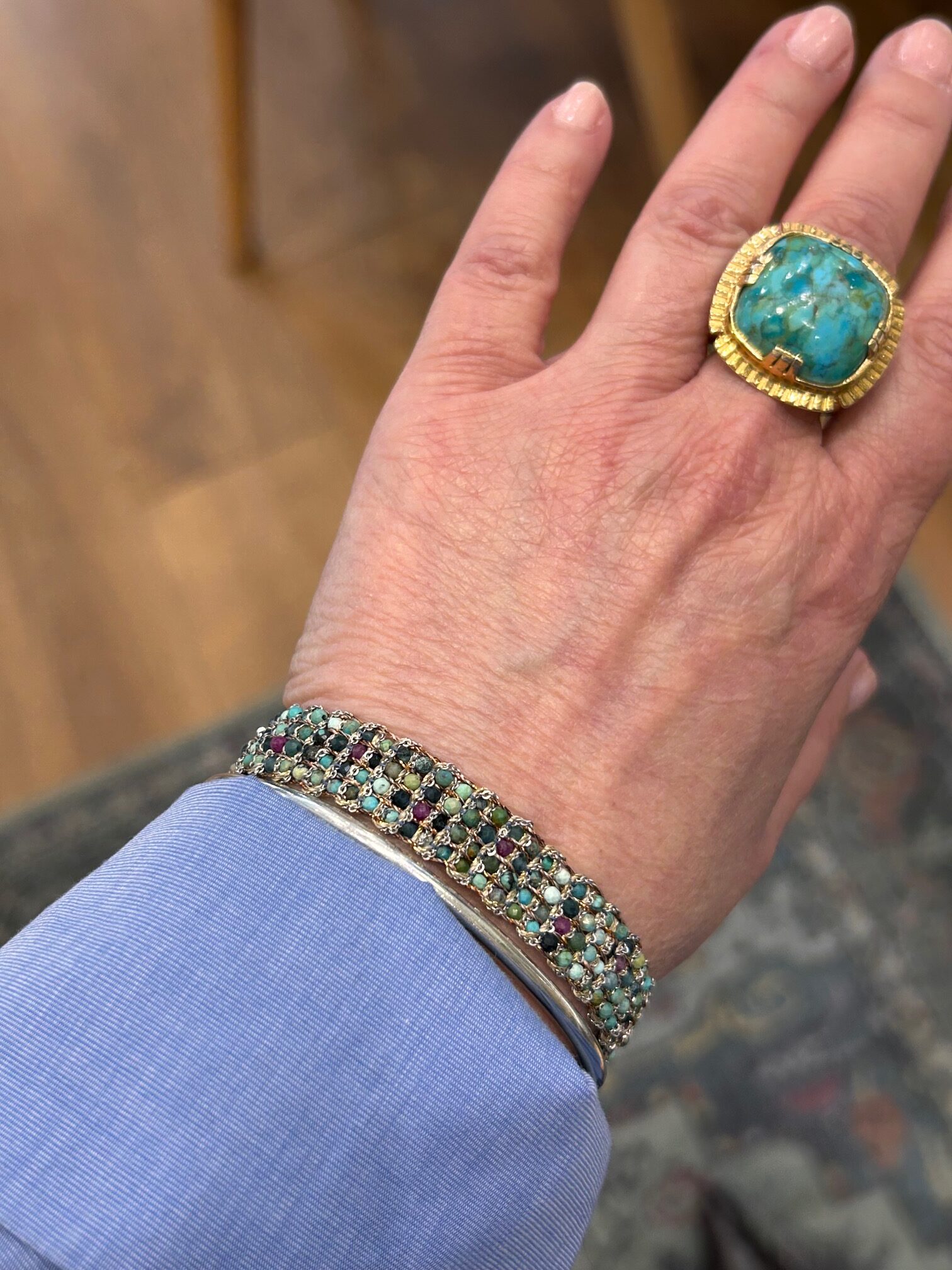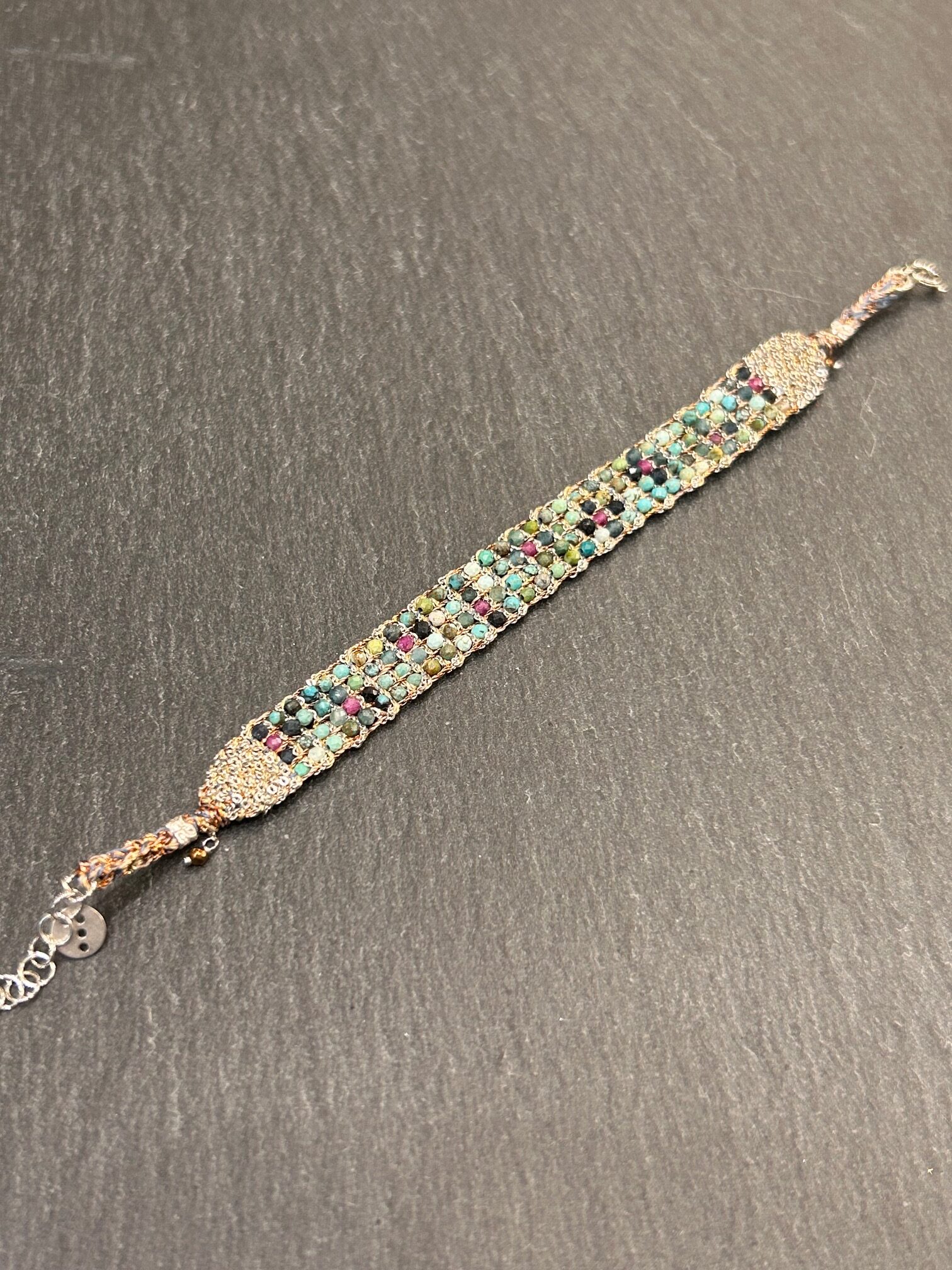 Les artisans de la maison DAG GIOIELLI sélectionnent avec soin chaque pierre. La turquoise illumine la pièce avec sa teinte vibrante. De plus, les tourmalines rouges et bleues apportent un contraste délicat et raffiné. L’argent tissé révèle, quant à lui, une texture subtile et contemporaine.