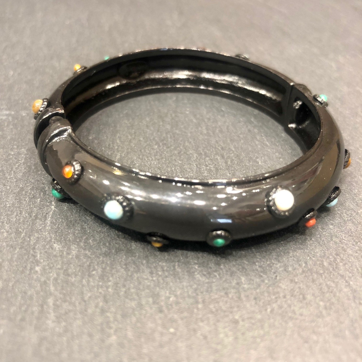 Bracelet rigide en métal noir orné de multiples cabochons en pierres fines.