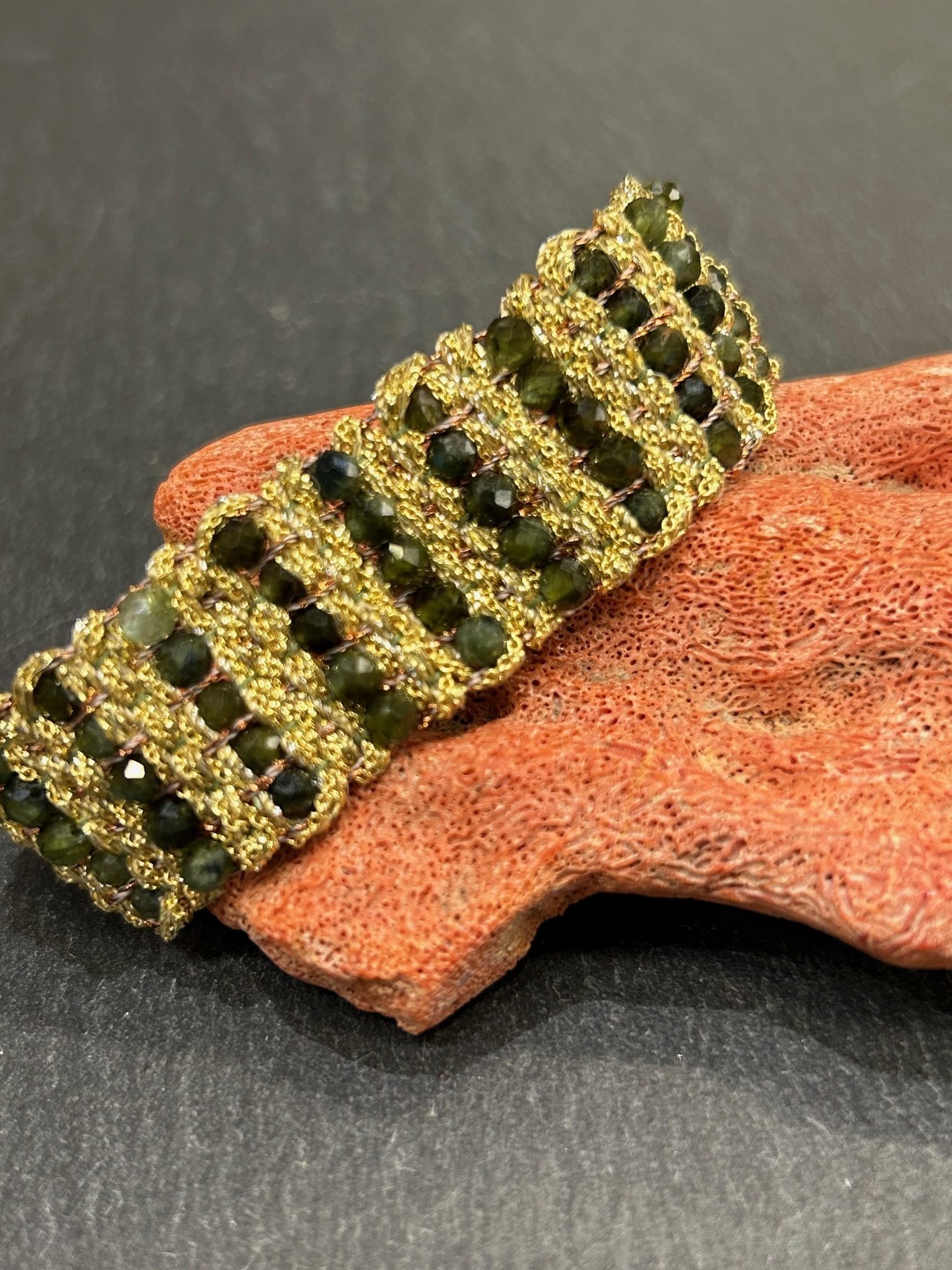 Bracelet tissé en argent 925 paqué or orné de 5 rangs de pierres semi précieuse tourmaline .