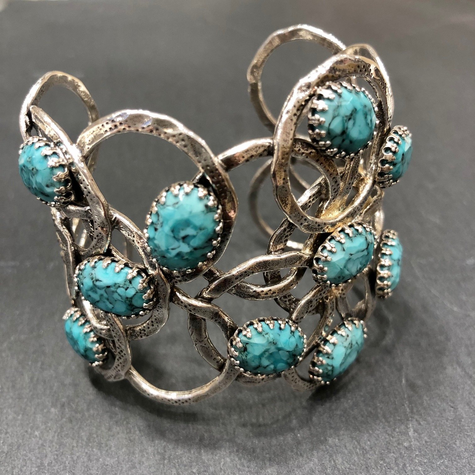 Bracelet manchette argentée composée d’anneaux martelés ornés de cabochon en turquoise. Taille ajustable. Hauteur 6,5 cm