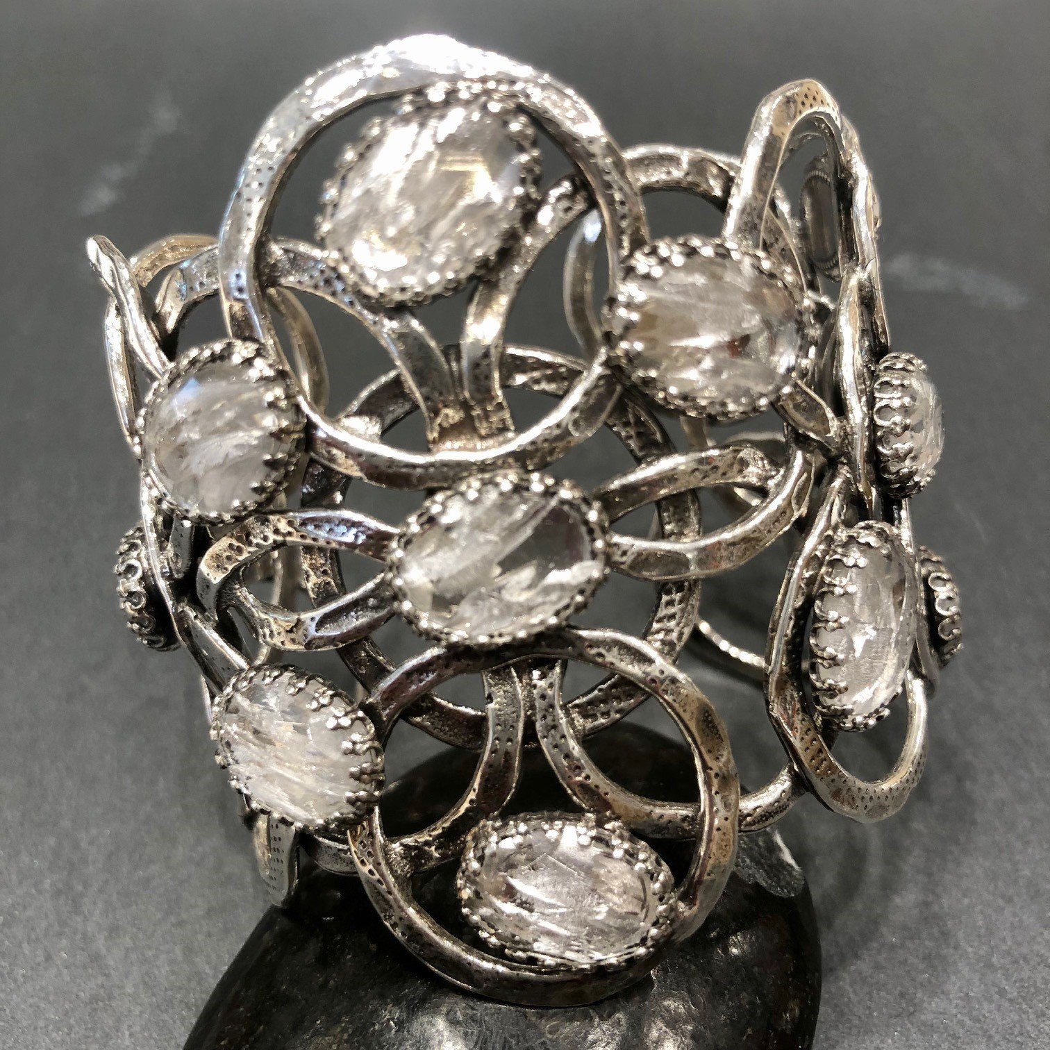 Bracelet manchette argentée composée d’anneaux martelés ornés de cabochon en nacre blanche. Taille ajustable. Hauteur 6,5 cm