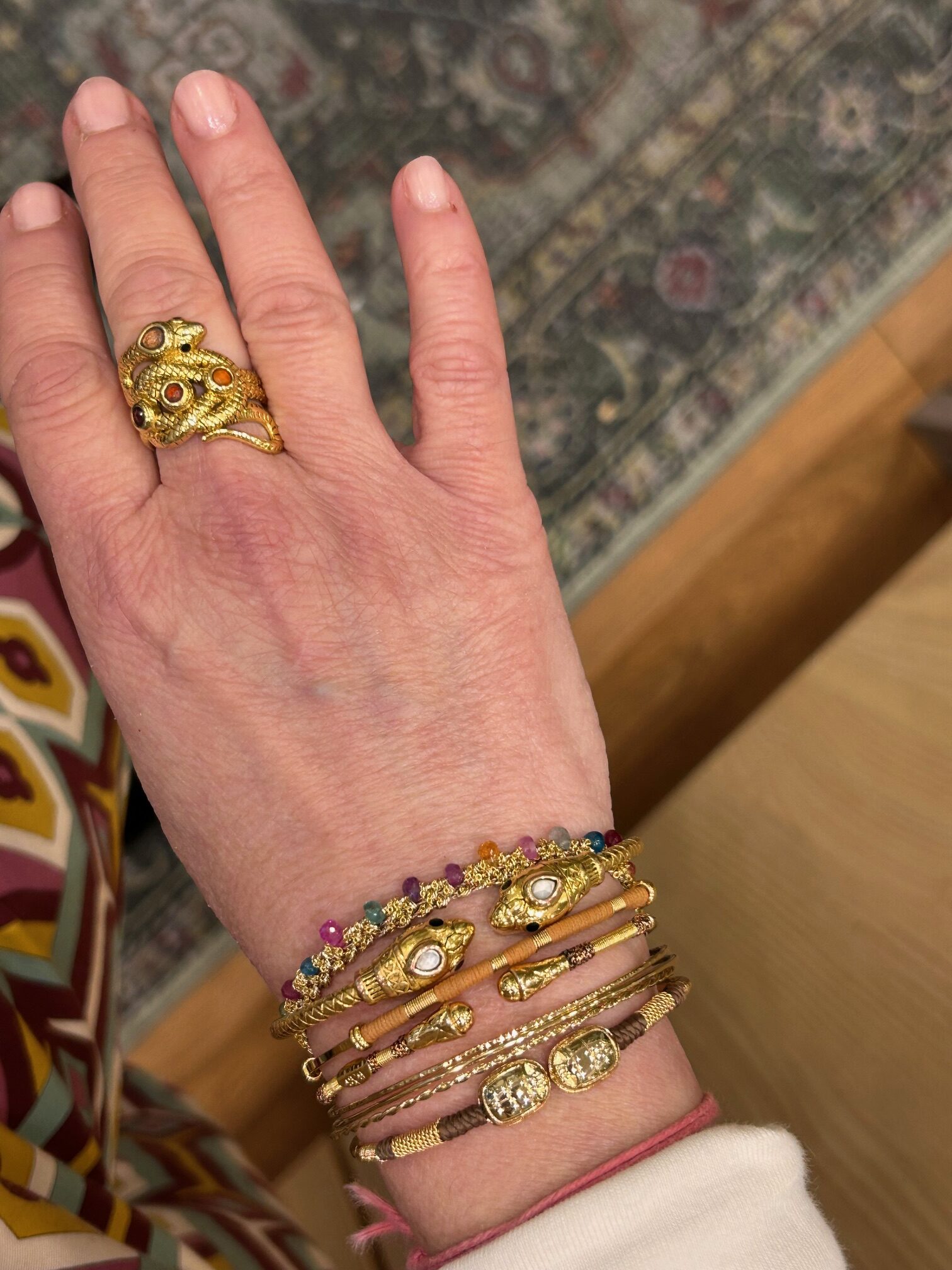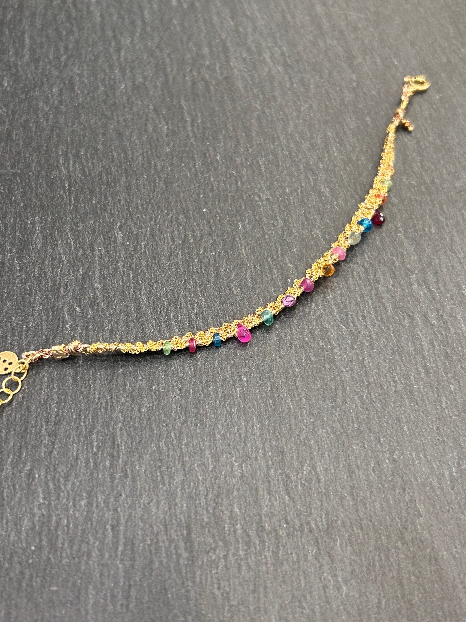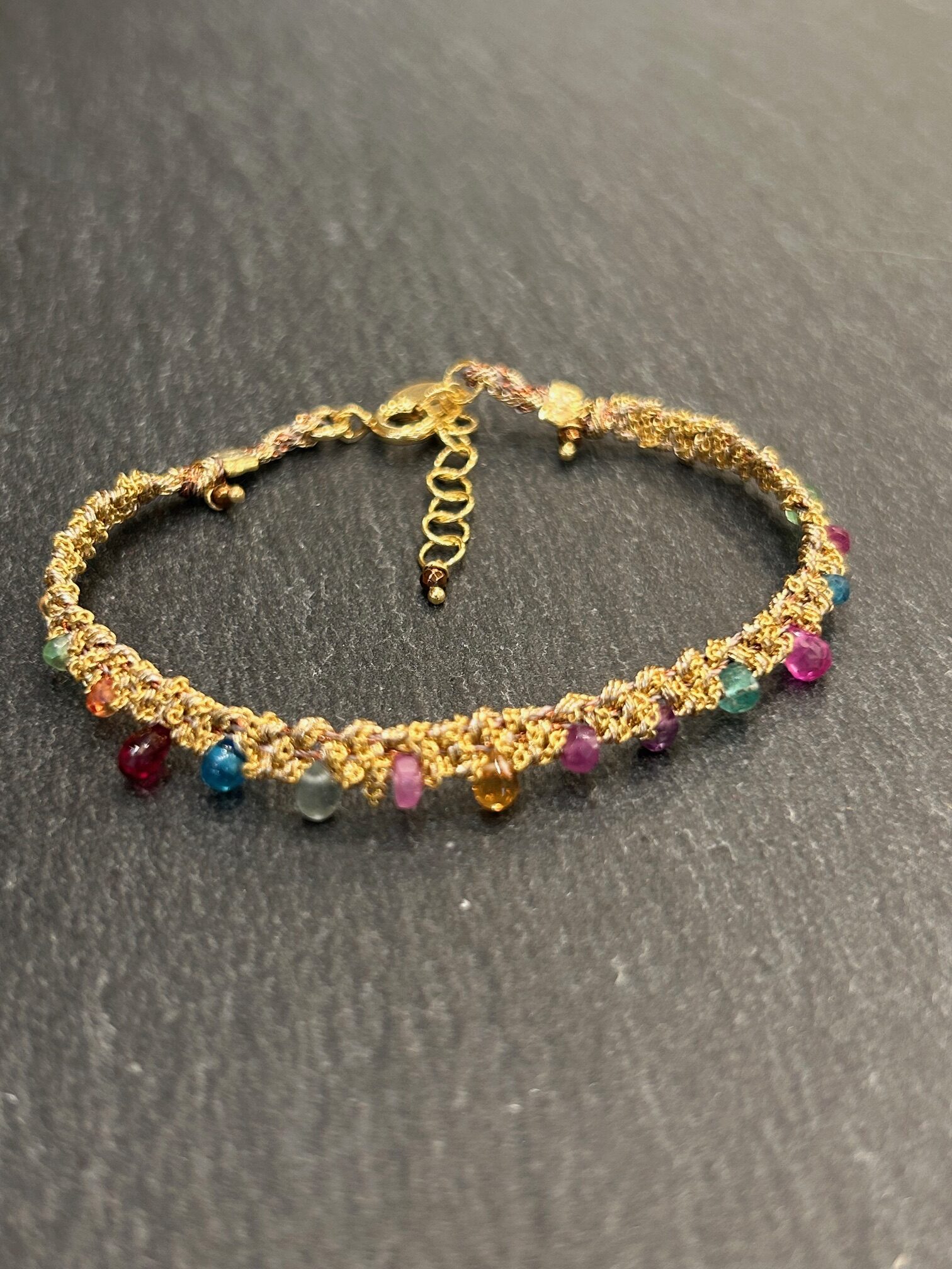 Les artisans milanais réalisent ce bracelet avec une grande précision. Ils tissent chaque pierre dans un fil d’argent plaqué or. Par ailleurs, ce savoir-faire artisanal garantit une finition soignée et durable. Chaque détail exprime une exigence de qualité et de finesse.