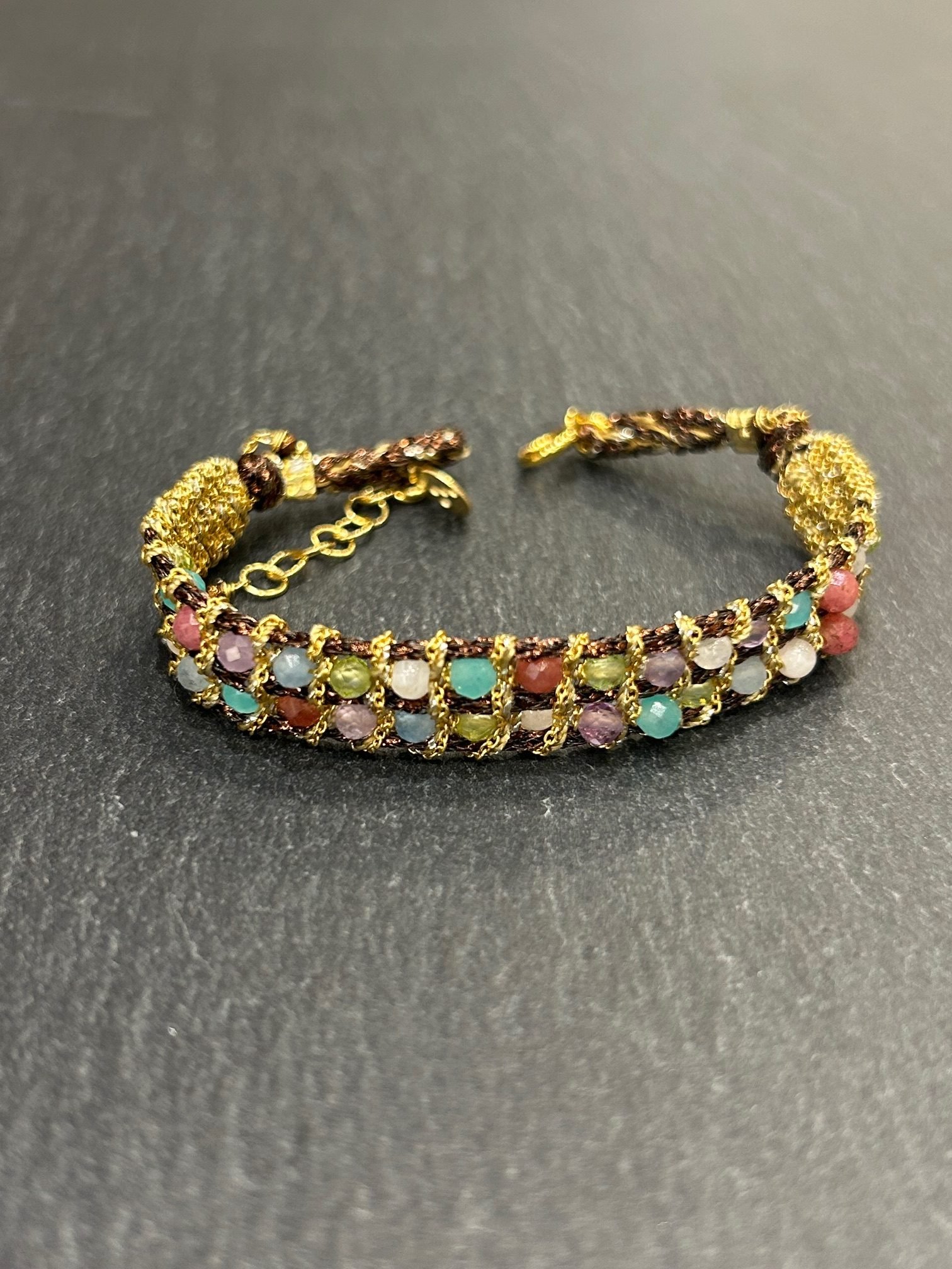 Bracelet tissé en argent 925 paqué or orné de 2 rangs de pierres semi précieuses.