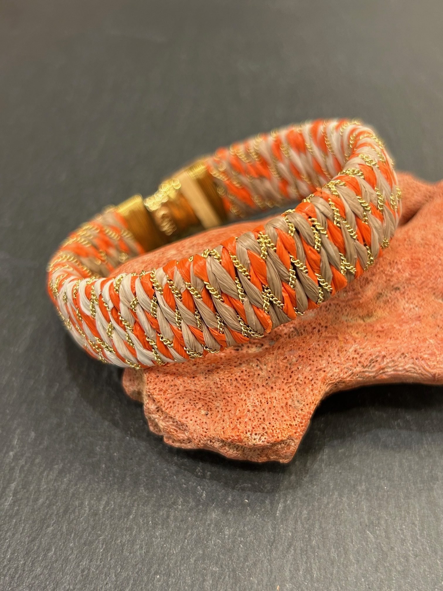 Bracelet Rofia, bracelet rigide ouvert finement habillé d’un tissage de fils beige et orange agrémenté d’une chaine dorée.