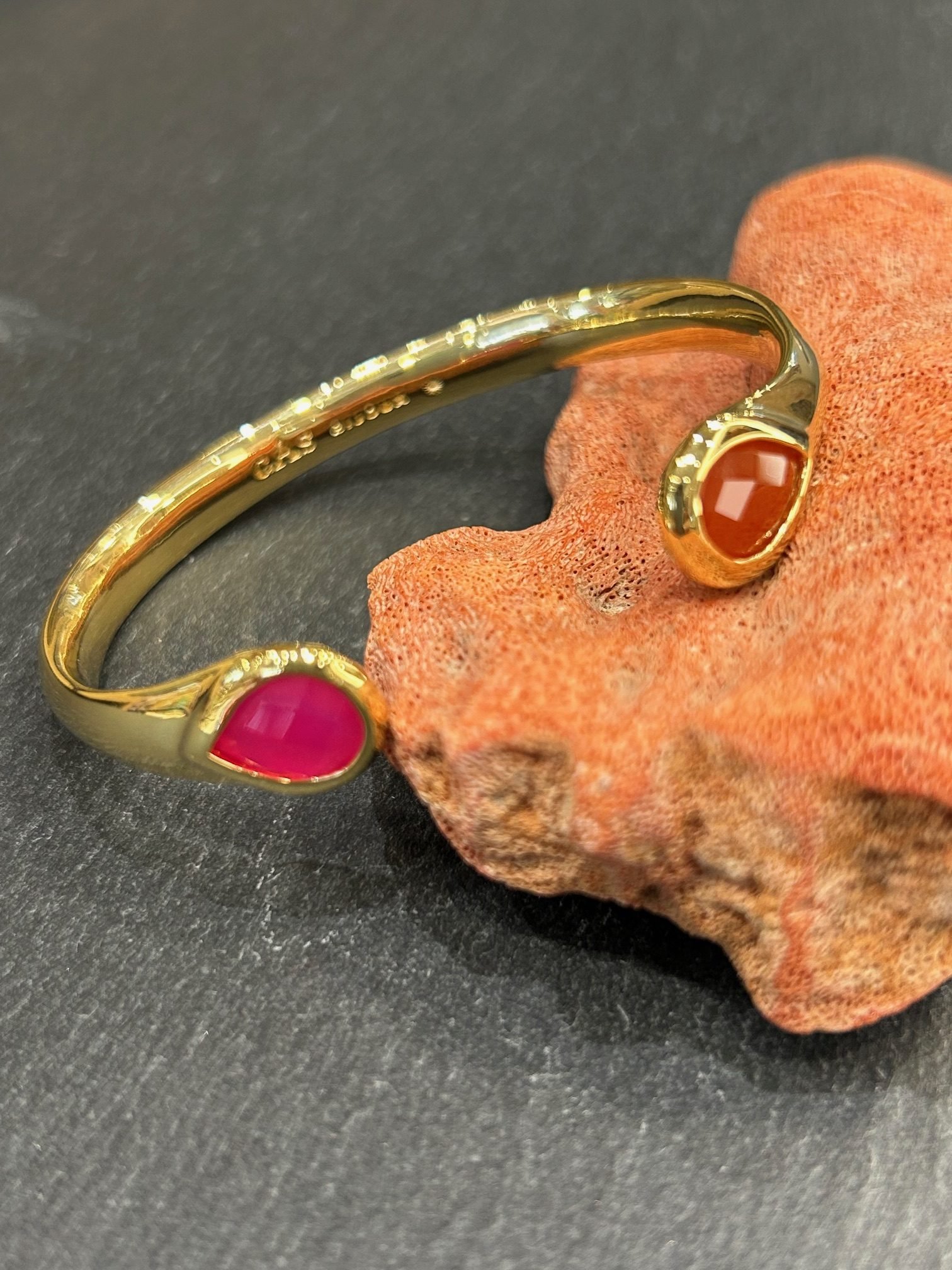 Bracelet Saint Germain, bracelet jonc rigide doré à l’or fin, terminant à ses extrémités par 2 cabochons en cornaline et rubis indien.