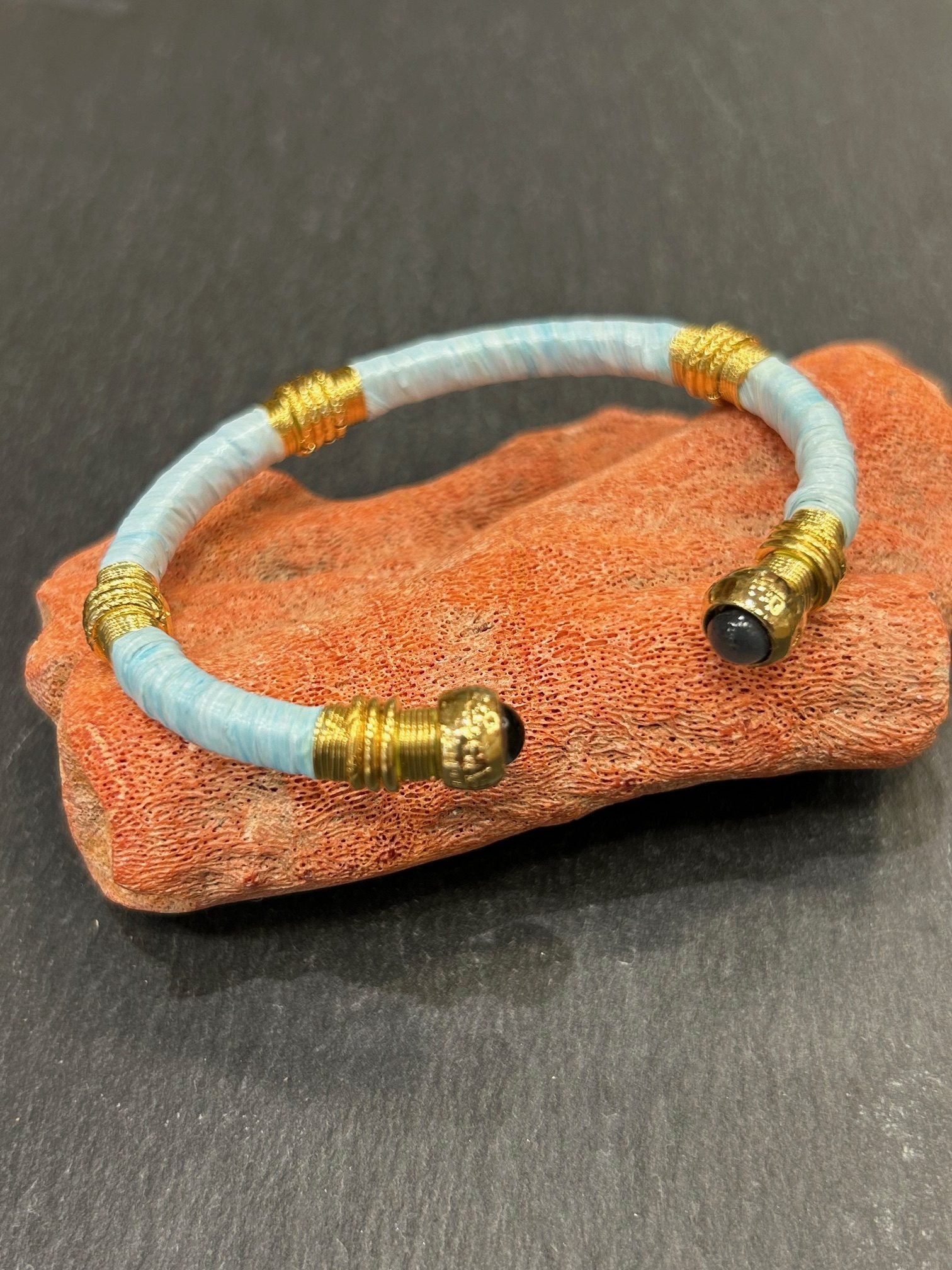 Bracelet Sari emballé, bracelet jonc rigide ouvert en acétate emballé de raphia ciel ,habillé de fils dorés et colorés , se terminant à ses extrémités par 2 cabochons calcédoine doré à l’or fin..