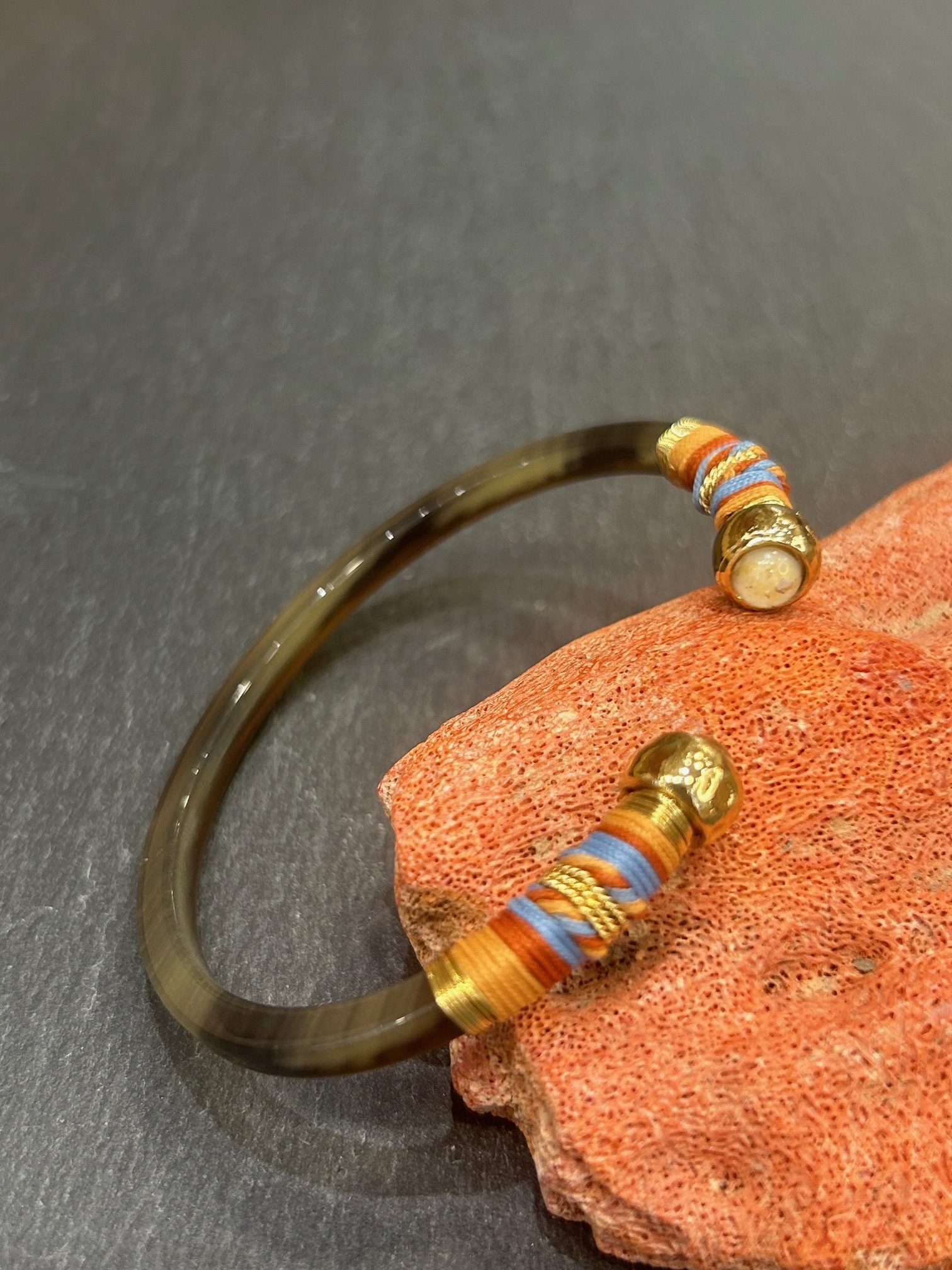 Bracelet Sari, bracelet jonc rigide ouvert en acétate coloris taupe ,habillé de fils dorés et colorés, se terminant à ses extrémités par 2 cabochons ivoire dorés à l’or fin..
